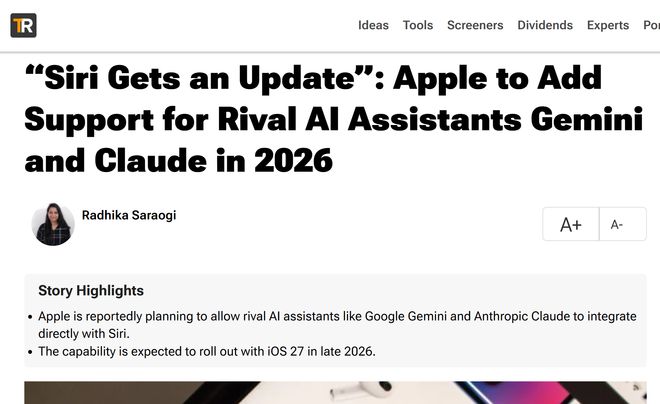 [环球网科技综合报道]3月27日消息,据TipRanks报道,苹果公司计划从iOS27系统开始,开放Siri的第三方AI接口,允许谷歌Gemini、AnthropicClaude等主流AI聊天机器人与Siri实现集成,这也意味着此前OpenAI与苹果Siri的独家合作地位将被打破。