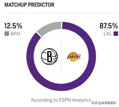 ESPN真是太看得起詹姆斯了!明天湖人将会坐镇主场迎战东部弱旅篮网,今天ESPN对于明天这场比赛进行了一番预测,ESPN预测湖人获胜的概率高达87.5%,而篮网只有12.5%的赢球概率。