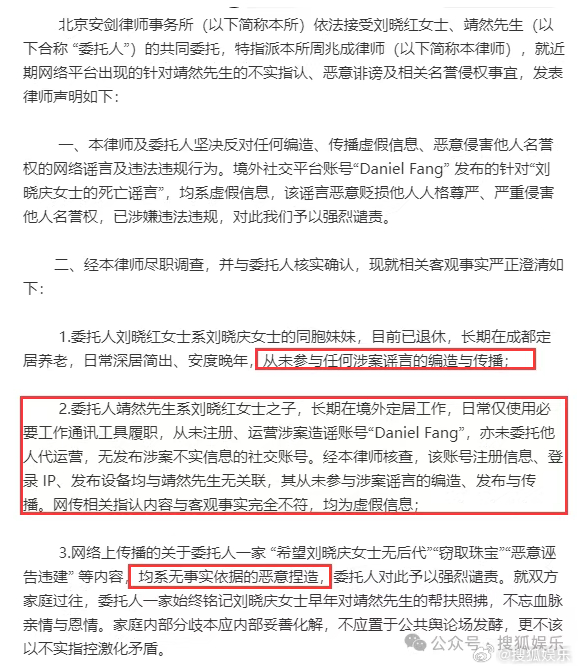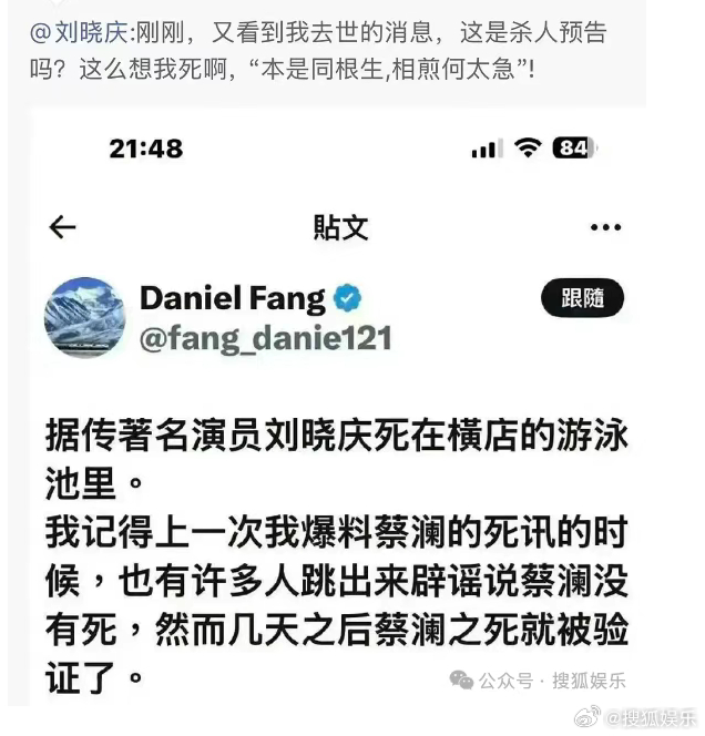 刘晓庆再发文辟谣去世前两天,刘晓庆发微博称:“又看到我去世的消息,这是杀人预告吗?这么想我死啊!”紧接着,她说“本是同根生,相煎何太急”。在刘晓庆微博附上的图片中可以看到,她推测造谣去世的人,不是别人,而是她的外甥靖然。但很快,刘晓庆妹妹刘晓红和外甥靖然委托律师发布声明,否认造谣。刘晓庆和妹妹一家的关系引发关注。刘晓庆外甥方否认造谣 详情→网页链接