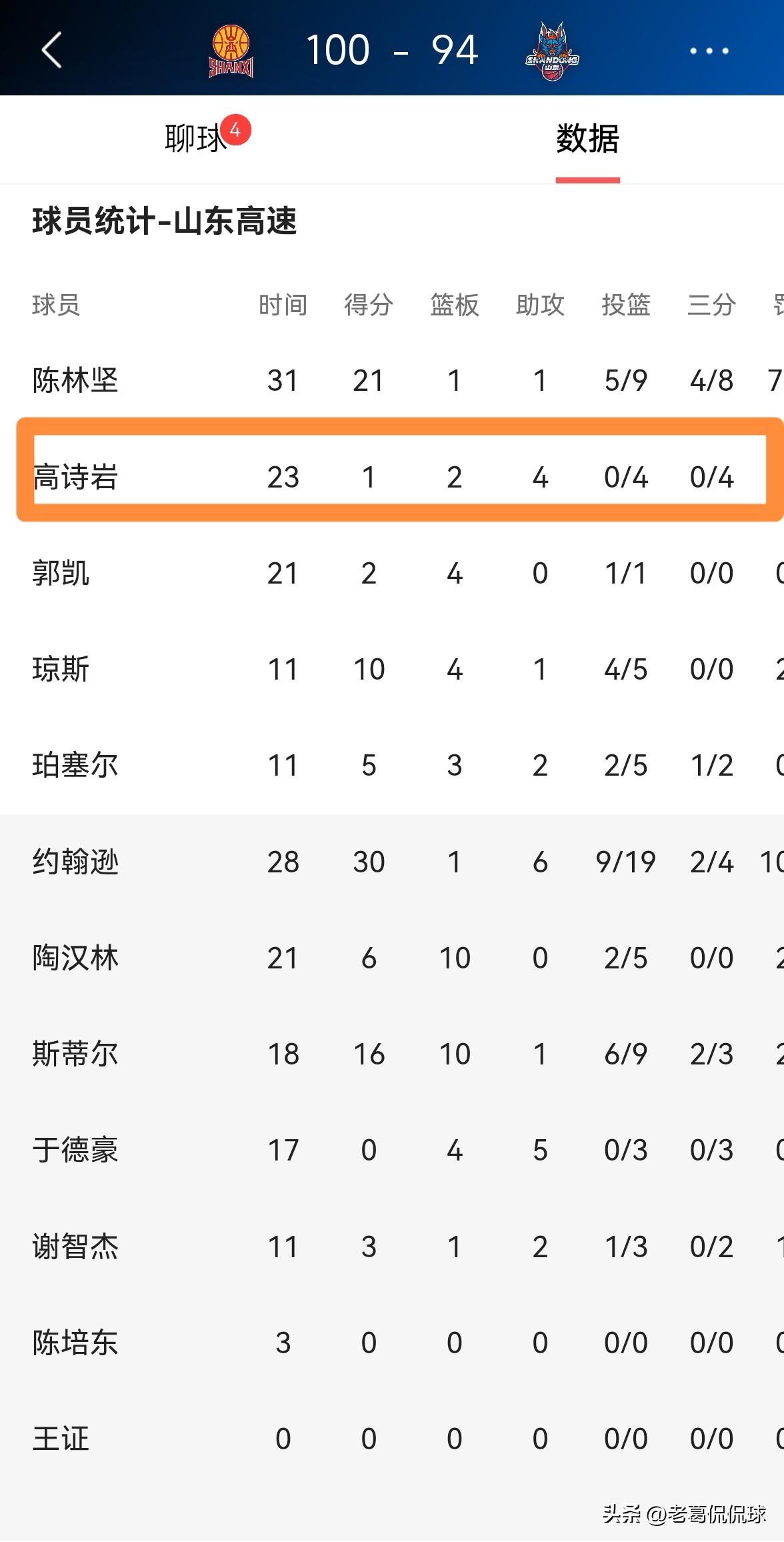 山东高速当家控卫高诗岩真是气死人了!在今天山东高速客场以94:100不敌山西汾酒的焦点战中,高诗岩在三分线外手感冰凉,竟然颗粒无收,并且出现了3次失误和5次犯规。