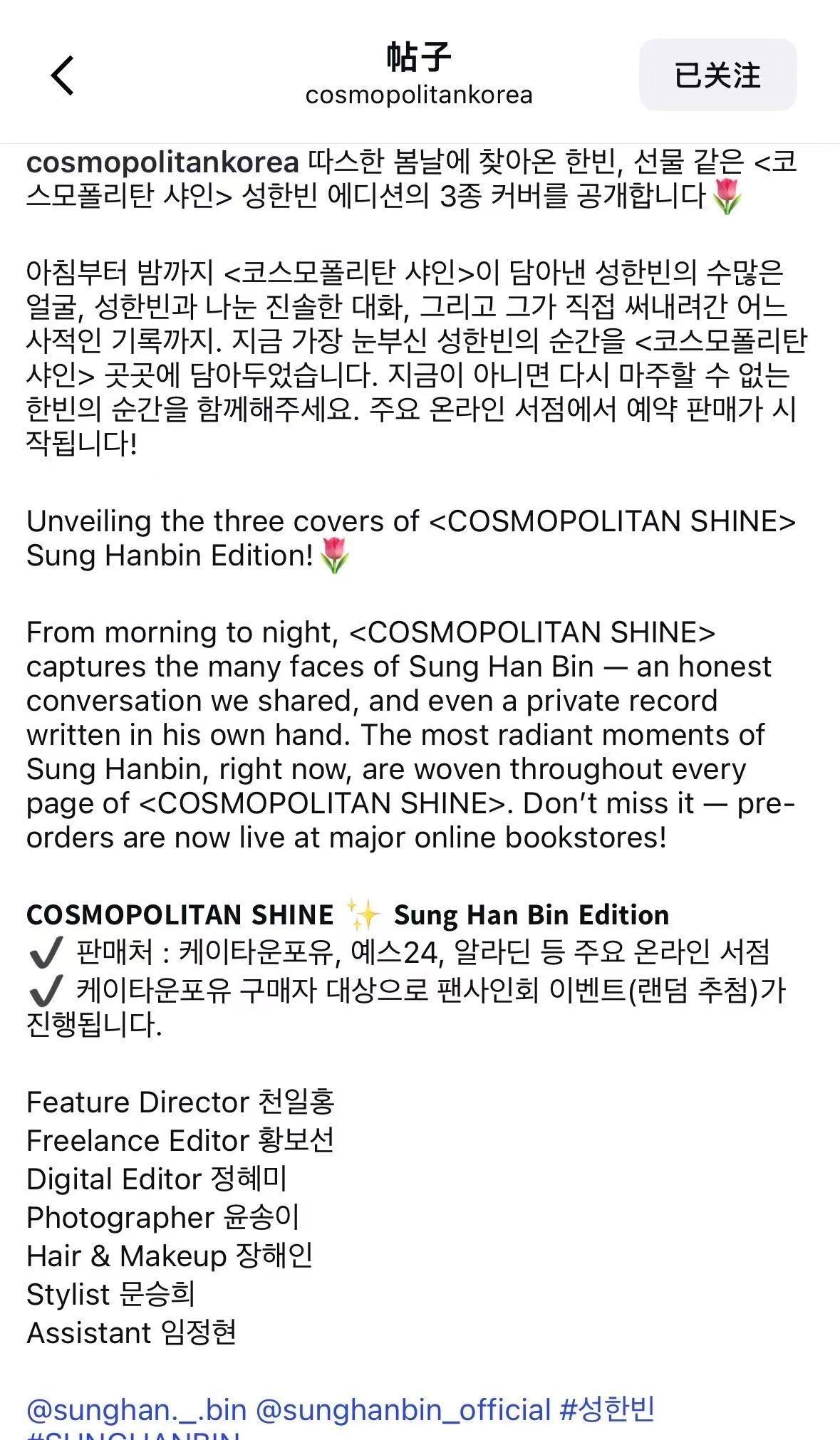 在温暖春日里如期而至的韩彬,带着礼物般的《COSMOPOLITAN SHINE》成韩彬版本,公开三种封面🌷