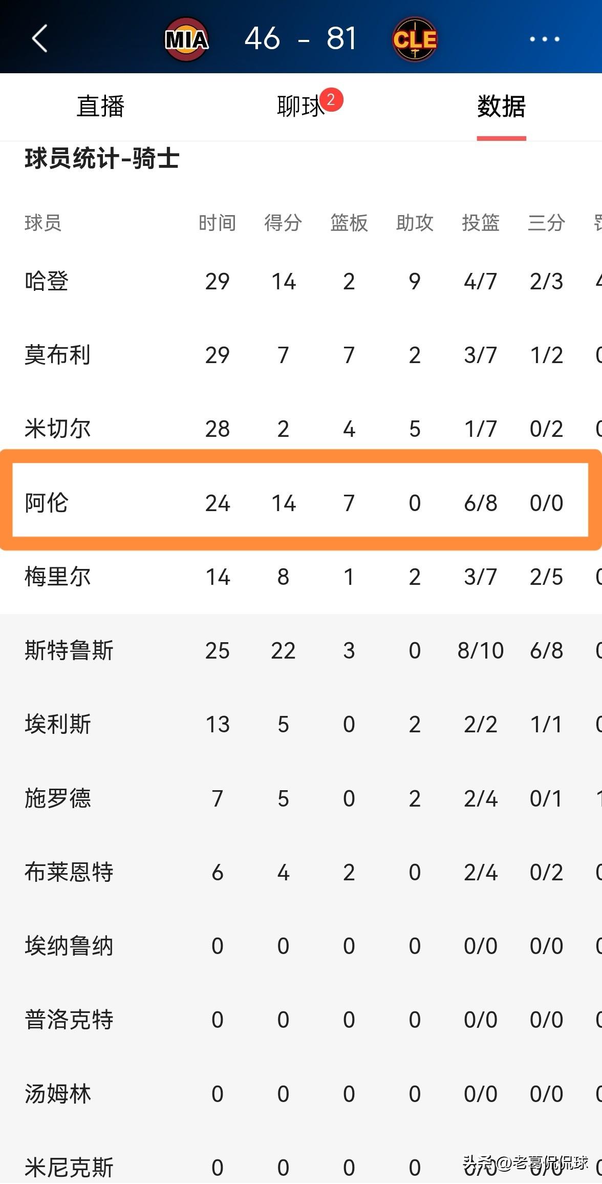 骑士当家中锋阿伦真是满血归来!在今天进行的骑士和热火的比赛中,目前两队的上半场比赛已经结束,骑士以81:46大比分领先对手。值得注意的是,本场比赛伤愈复出的阿伦展现出了非常火热的状态,他在首发出战的24分钟里,投篮8中6,其中罚球2中2相当高效的砍下14分,还有7篮板,他的场上正负值为+25。