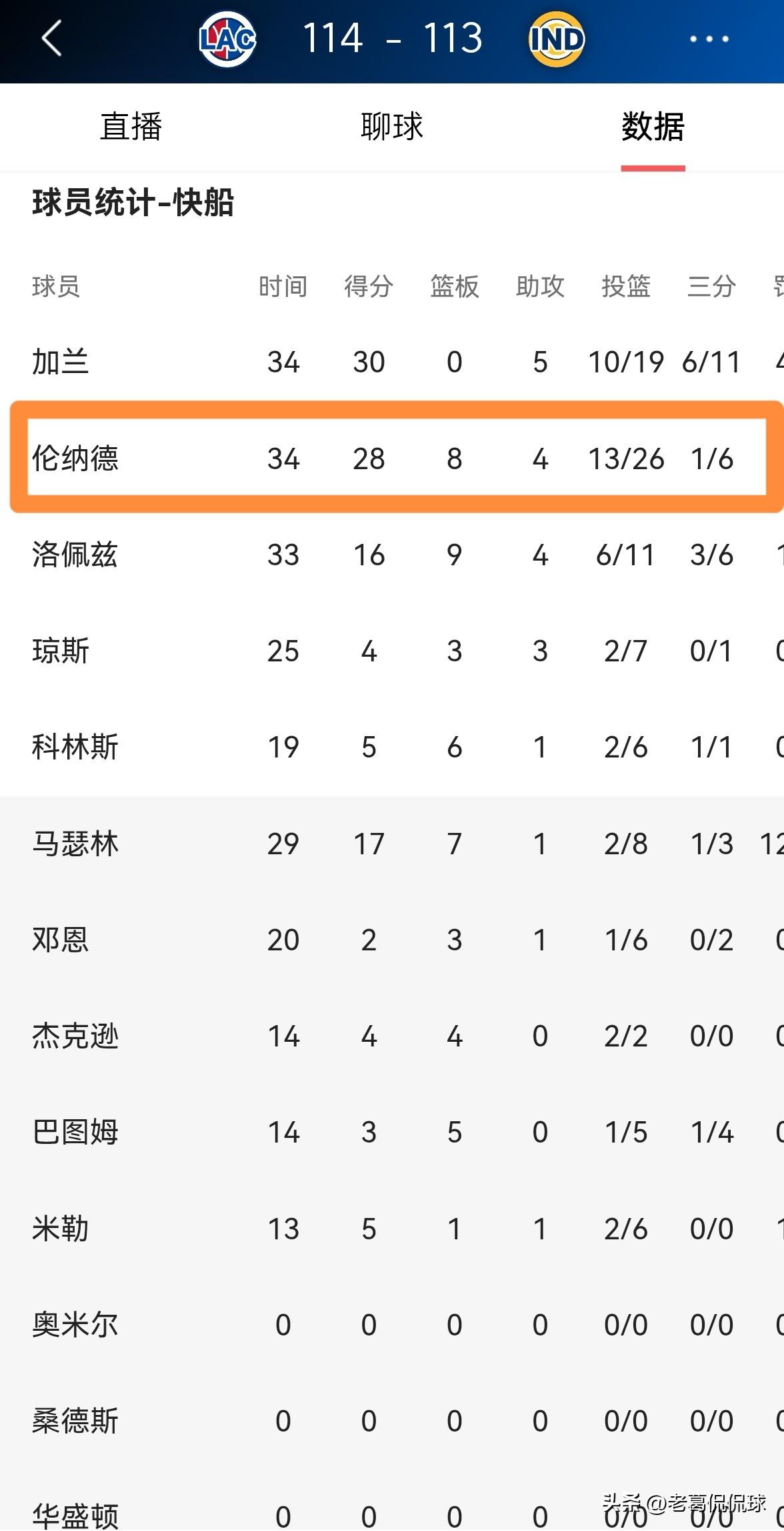 快船当家球星伦纳德真是太不受裁判照顾了!在今天快船客场以114:113险胜步行者的比赛中,投进准绝杀的伦纳德仅仅得到了2次罚球,由此可见伦纳德是多么的不受裁判照顾。