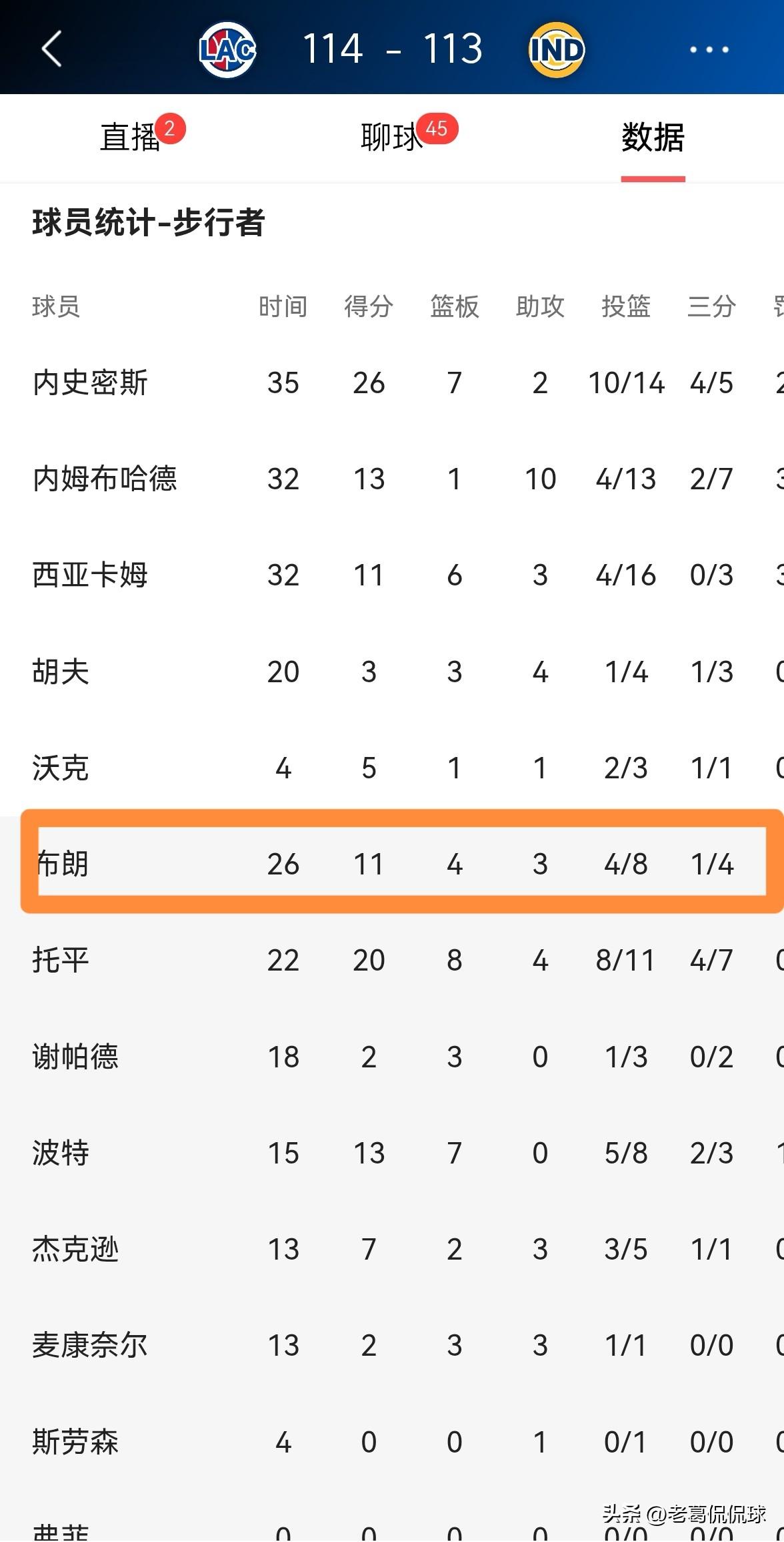 实事求是的说,本场比赛布朗用自己在攻防两端的精彩表现狠狠地打了老东家的脸,事实证明,快船将布朗交易到步行者完全就是一个错误。