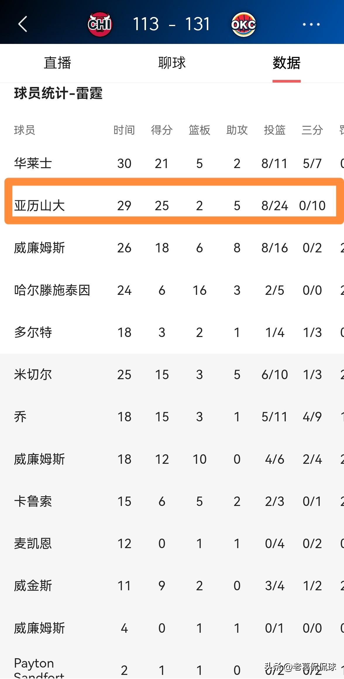 整场比赛下来,亚历山大首发出战29分钟,投篮24中8,其中三分球10中0、罚球12中9非常低效的得到25分。