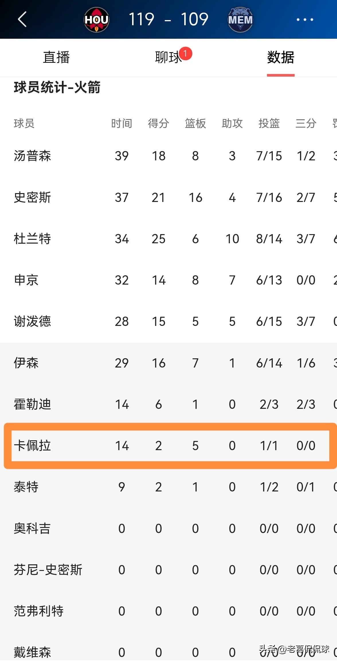 火箭中锋卡佩拉真是太不想得分了!在今天火箭客场以119:109战胜灰熊的比赛中,卡佩拉在进攻端毫无得分欲望,整场比赛下来卡佩拉仅仅出手了1次。