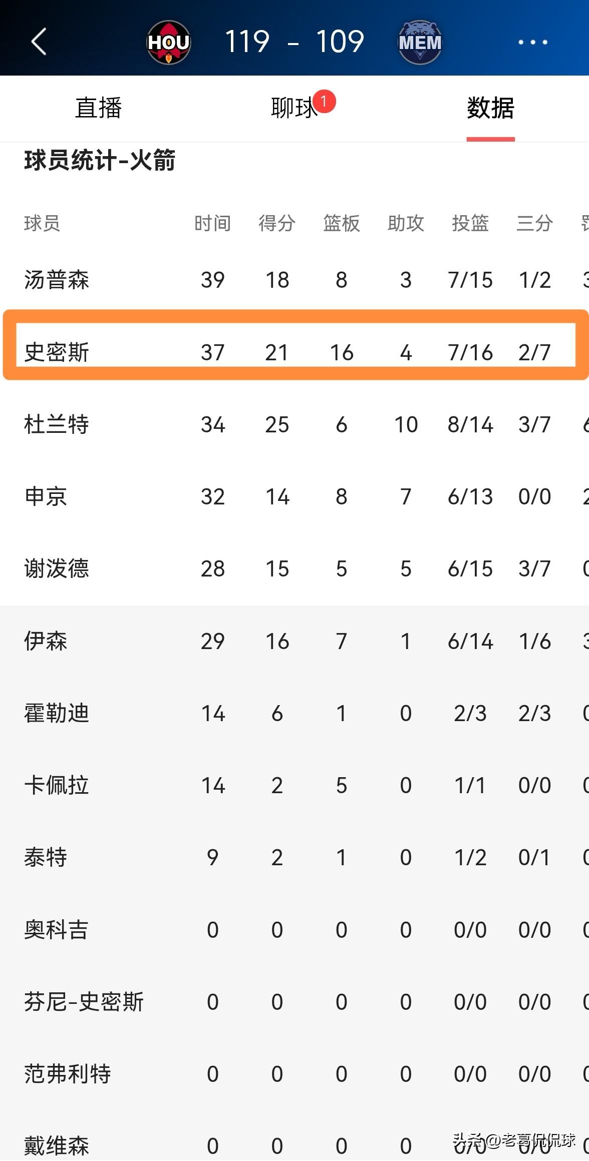 火箭大将小史密斯真是太能抢篮板了!在今天火箭客场以119:109战胜灰熊的比赛中,小史密斯展现出了非常强的篮板球拼抢能力,全场比赛下来小史密斯疯狂的抢到全队最多的16个篮板。