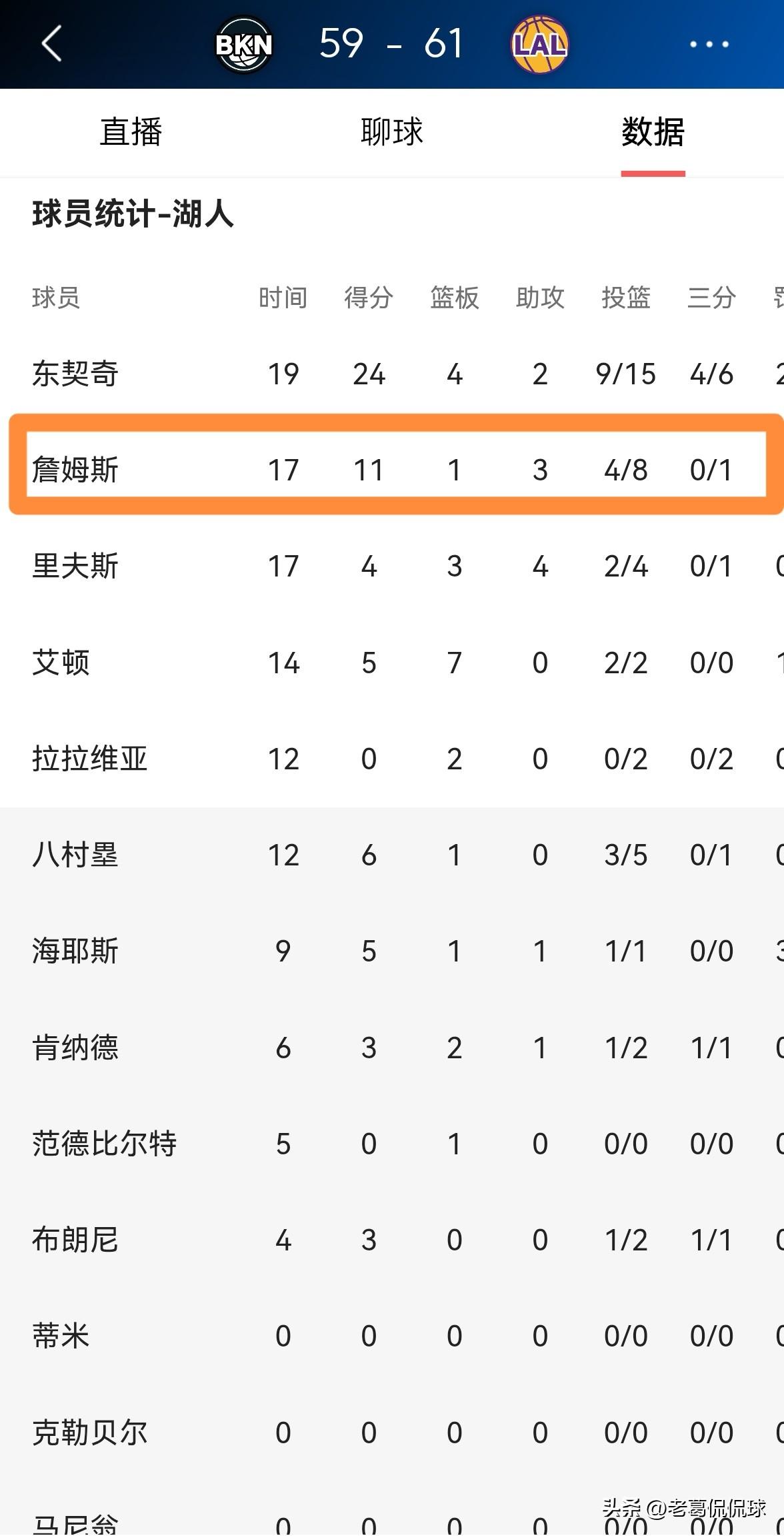 湖人巨星詹姆斯真是越来越懒了!在今天湖人主场迎战篮网的比赛中,目前双方半场战罢,湖人以61:59领先对手2分。值得注意的是,在前两节比赛中,詹姆斯在拼抢篮板方面显得非常不积极,仅仅抢到了1个篮板。