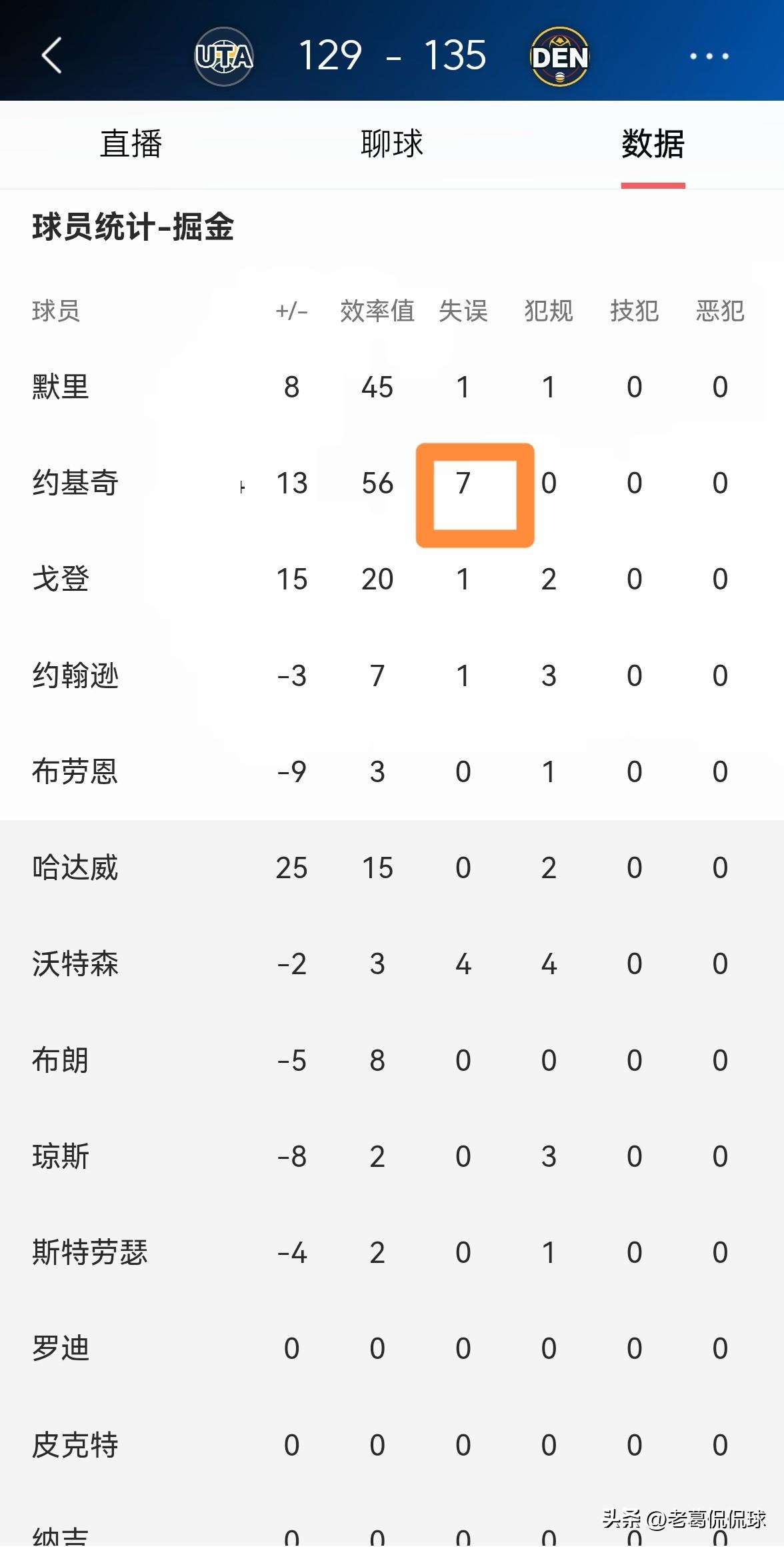 掘金超级巨星约基奇险些怒砍四双!在今天掘金主场以135:129力克爵士的比赛中,约基奇在豪取三双的情况下出现了多达7次的失误,险些怒砍四双。
