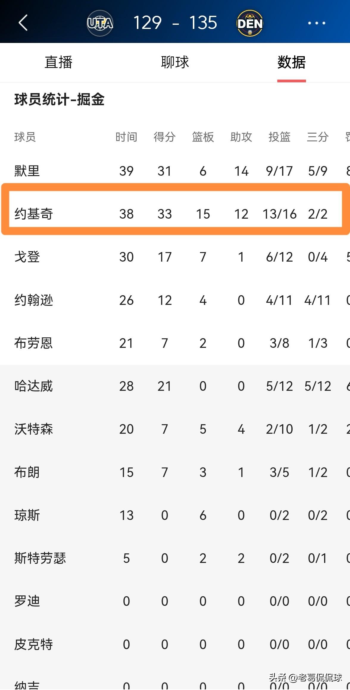 全场比赛下来,约基奇首发出战38分钟,投篮16中13,其中三分球2中2、罚球8中5极其高效的砍下33分15篮板12助攻1抢断,外加7次失误,他的场上正负值为+13。