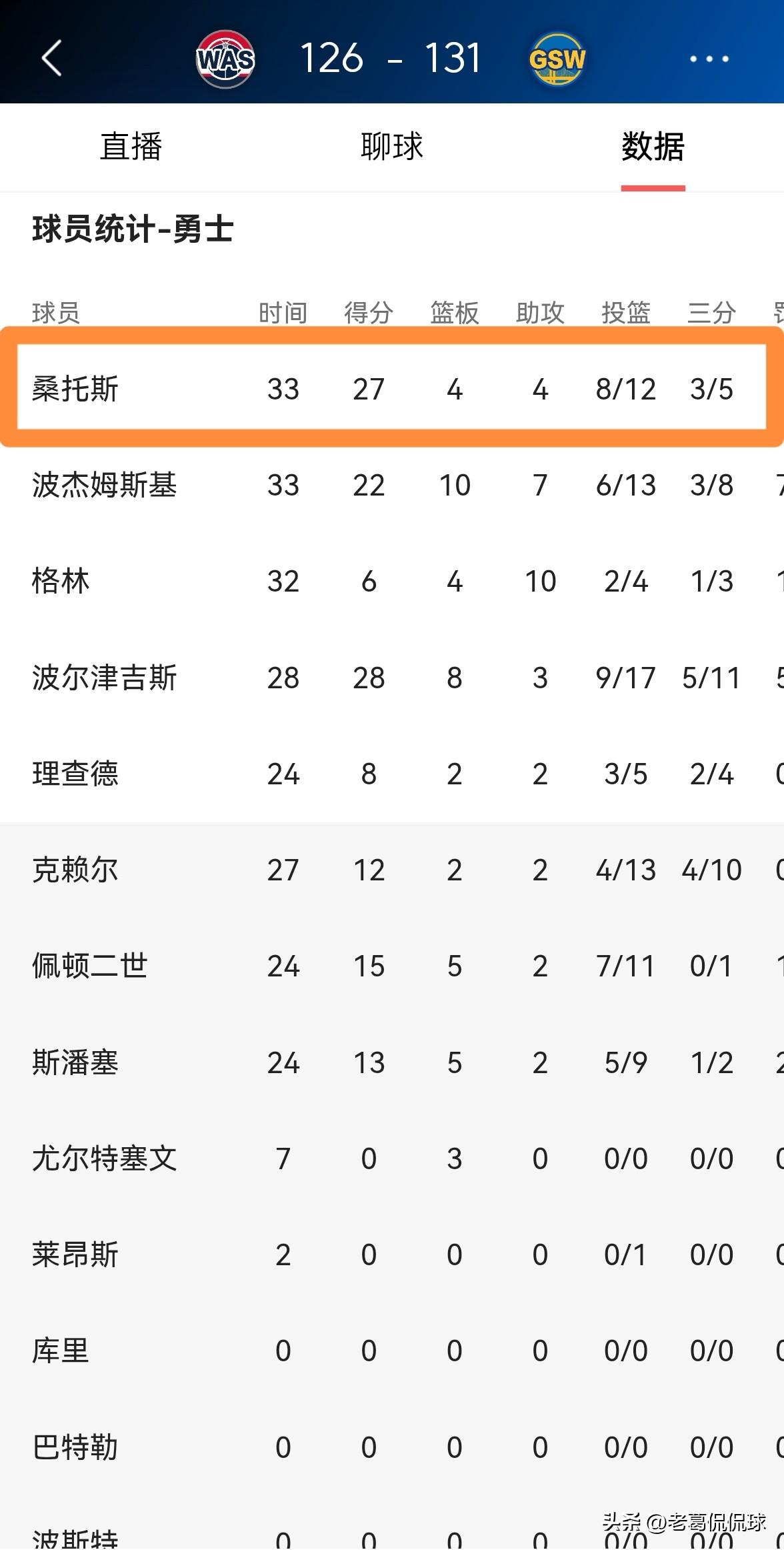 勇士大将桑托斯真是越来越出彩了!在今天勇士主场以131:126力克奇才的比赛中,桑托斯延续了自己最近一段时期的出色表现,他在首发出战的33分钟里,投篮12中8,其中三分球5中3、罚球9中8相当高效的砍下27分,外加4篮板4助攻,他的场上正负值为+5。
