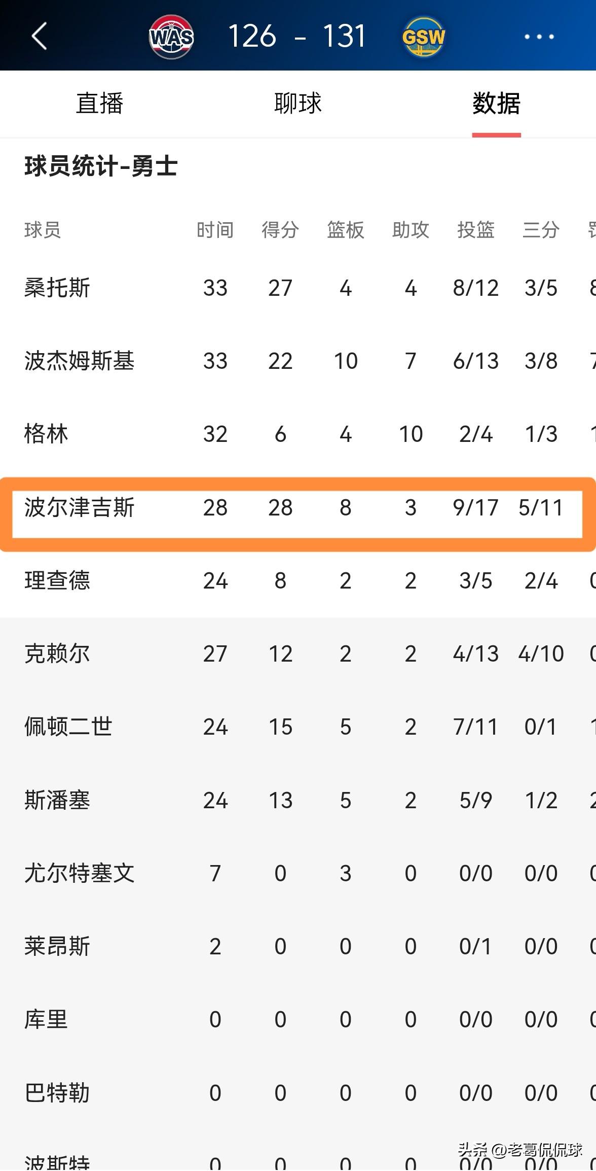 勇士球星波尔津吉斯真是功不可没!今天勇士在主场以131:126力克奇才,喜迎两连胜。值得一提的是,本场比赛波尔津吉斯打出了无可挑剔的表现,他是球队能够赢球的最大功臣。