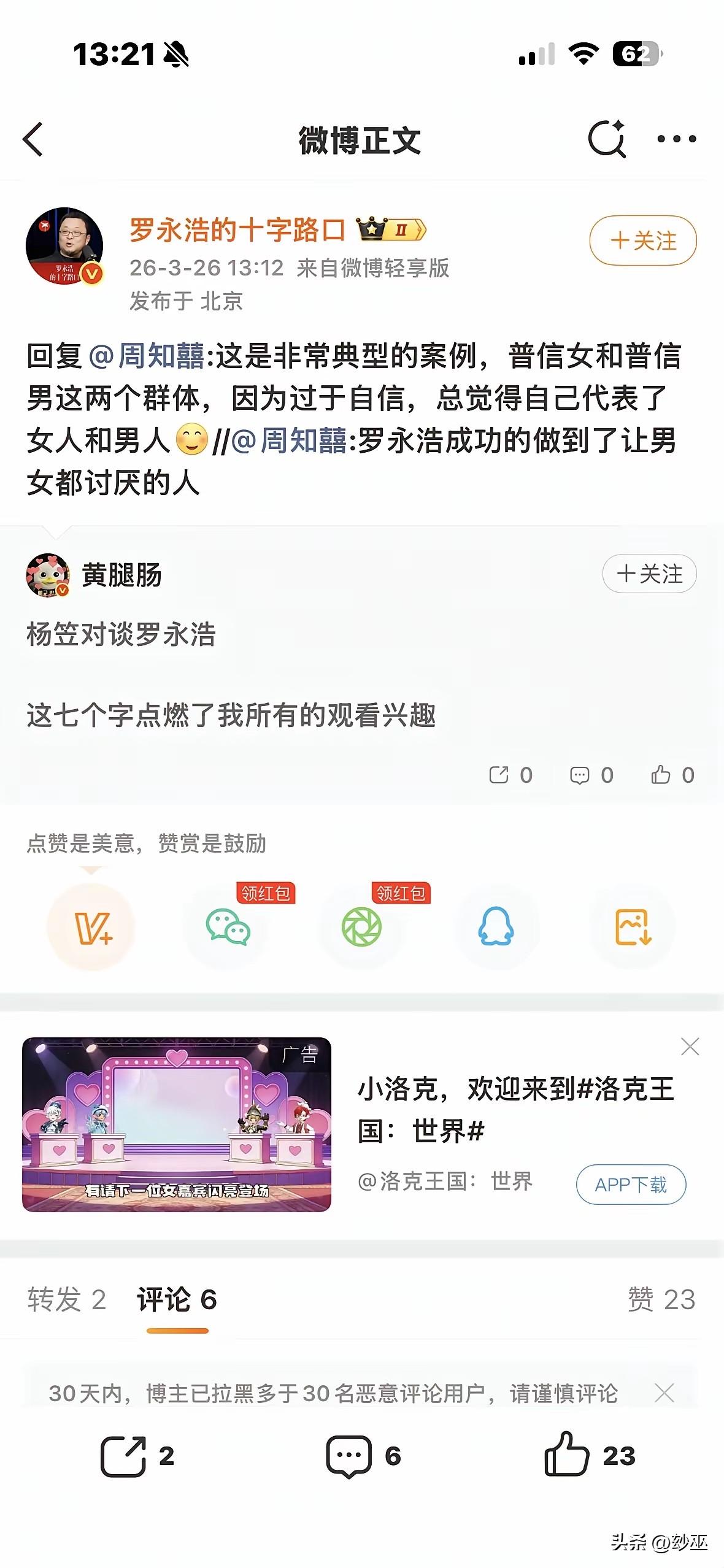 而罗永浩和杨笠,双方可能都需要对方。罗永浩需要杨笠这种争议人物制造话题爆点,杨笠需要罗永浩的脱口秀渠道发声来洗脱一下自己之前的不利言论。