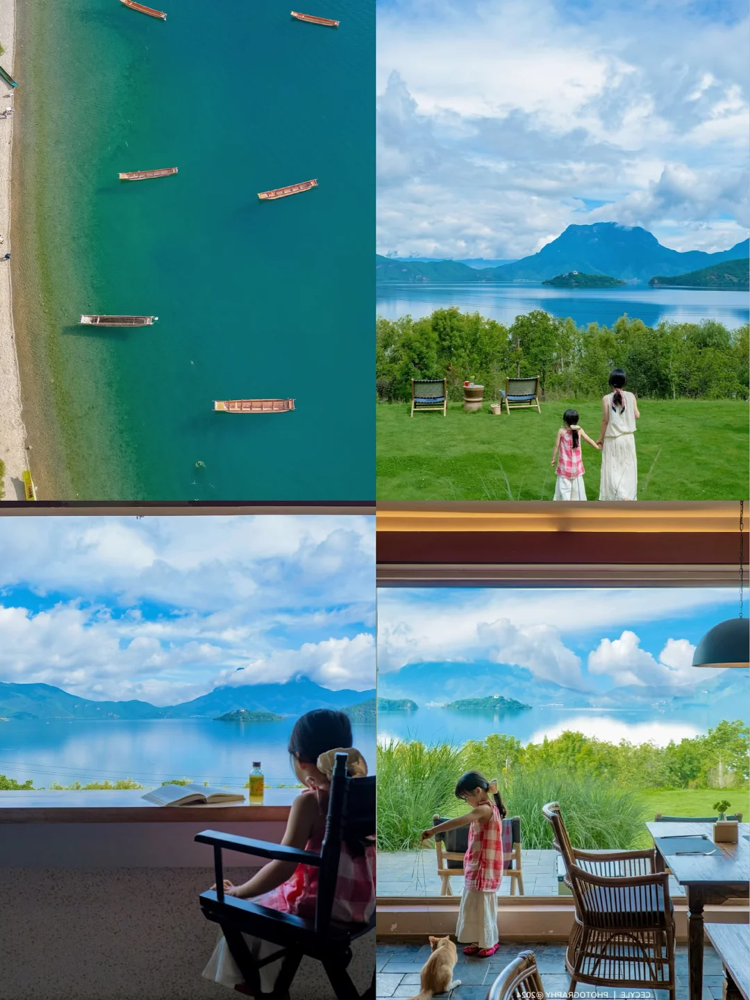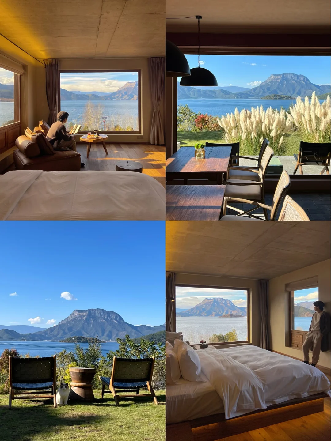 有着巴厘岛鸟巢FEEL打卡,泸沽湖全景尽收眼里,无遮挡的大厅配有钢琴拍照,配音乐,观湖光山色