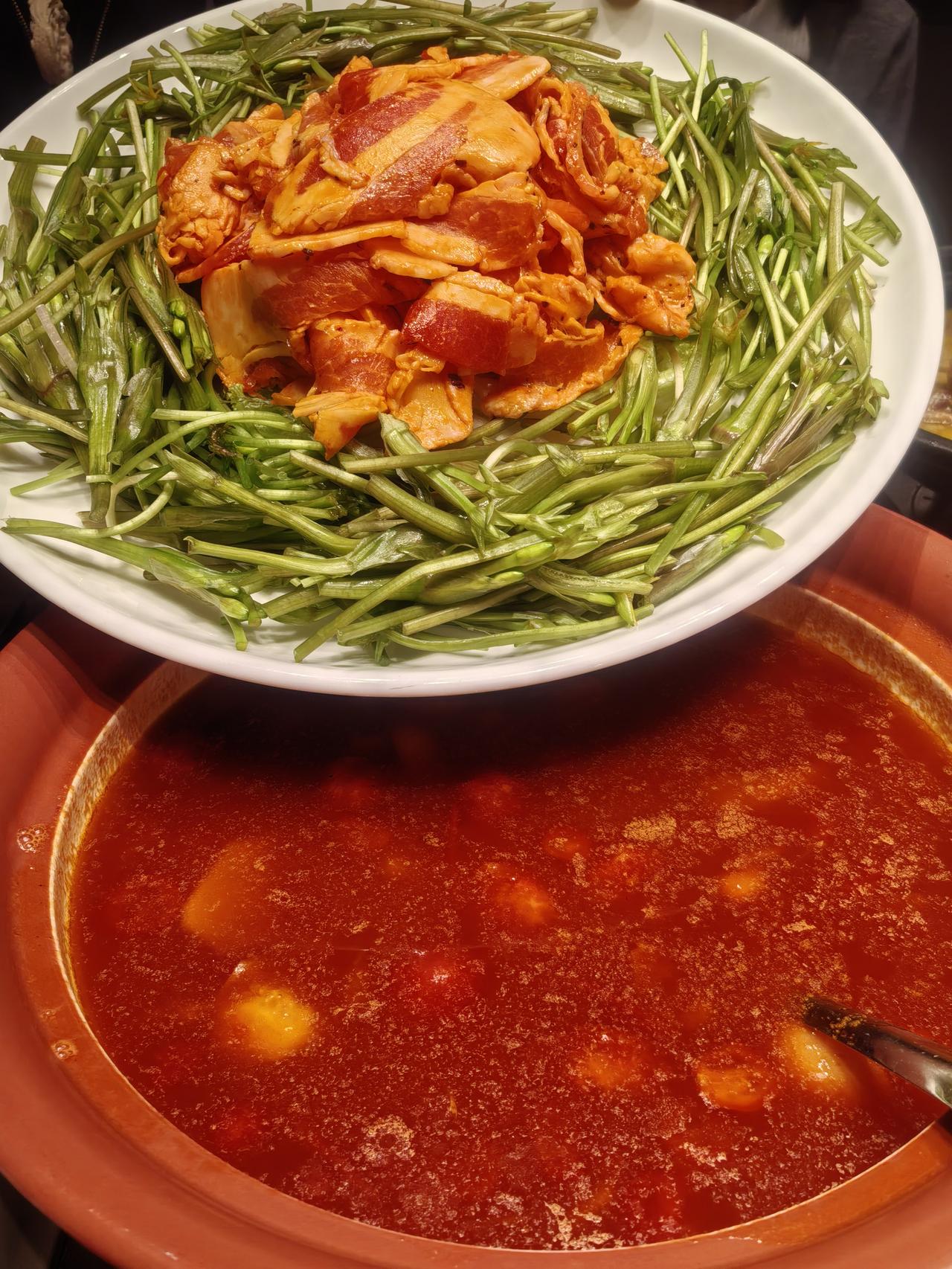 🌿 水性杨花(海菜花)脆嫩清甜,土猪肉片吸饱野果酸汤,酸香开胃,涮煮后鲜味直冲天灵盖!
