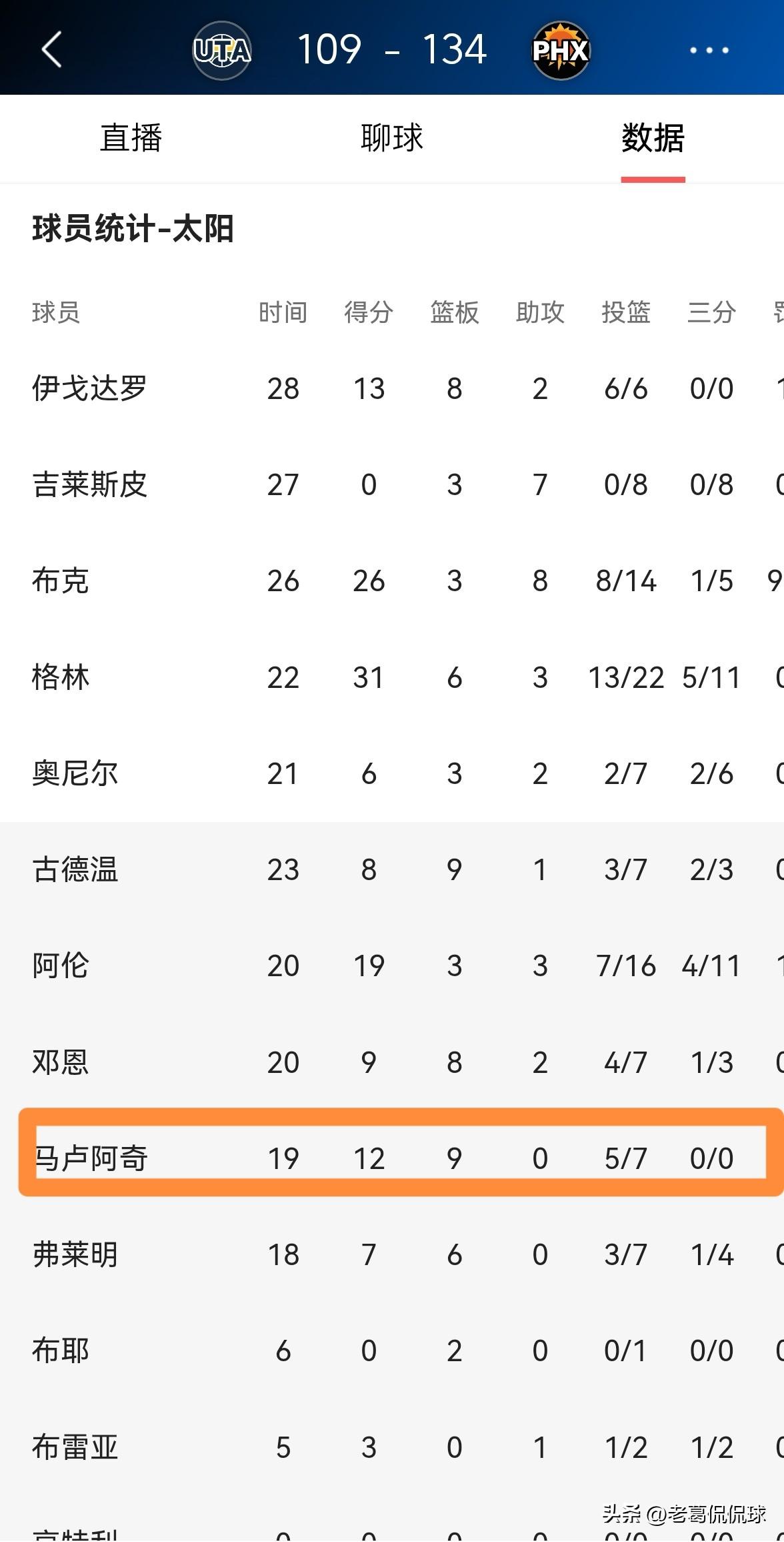 太阳新秀马鲁阿奇真是太让人喜出望外了!在今天太阳主场以134:109轻取爵士的比赛中,小将马鲁阿奇在攻防两端都打出了无可挑剔表现,展现出了非常强的护筐能力和封盖能力。