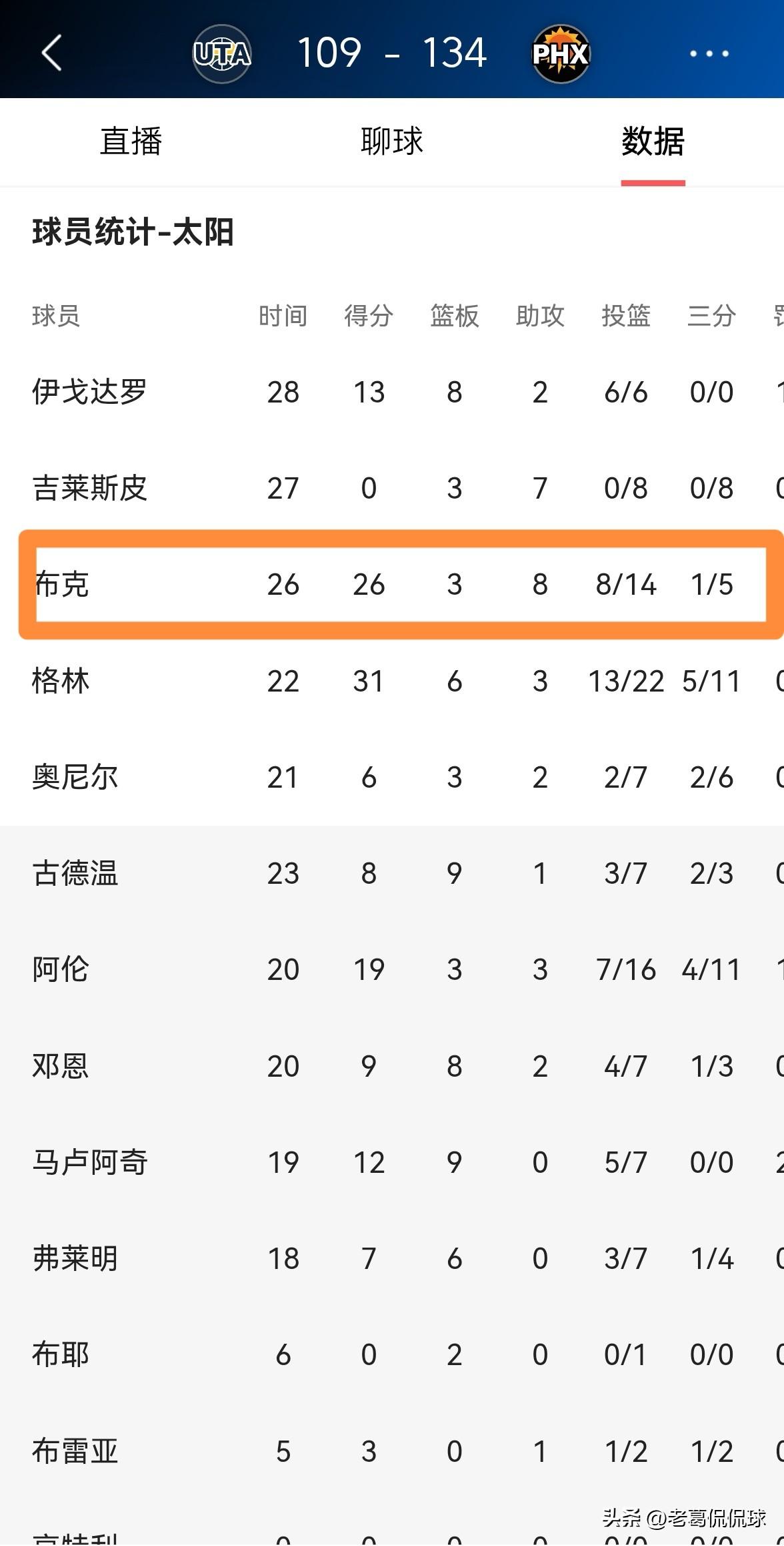 整场比赛下来,布克首发出战26分钟,投篮14中8,其中三分球5中1、罚球10中9得到26分,还有3篮板8助攻1抢断1盖帽,他的场上正负值为+21。