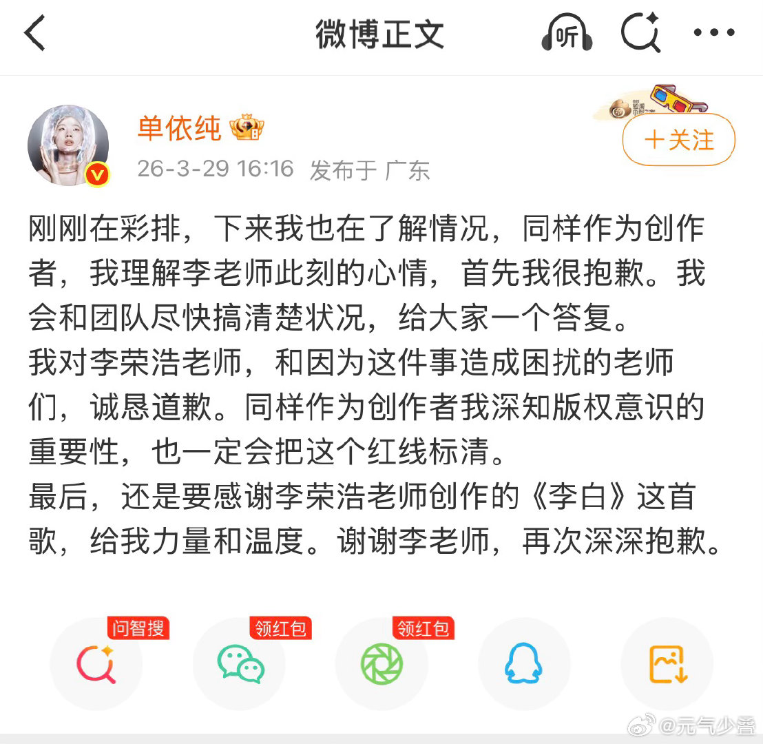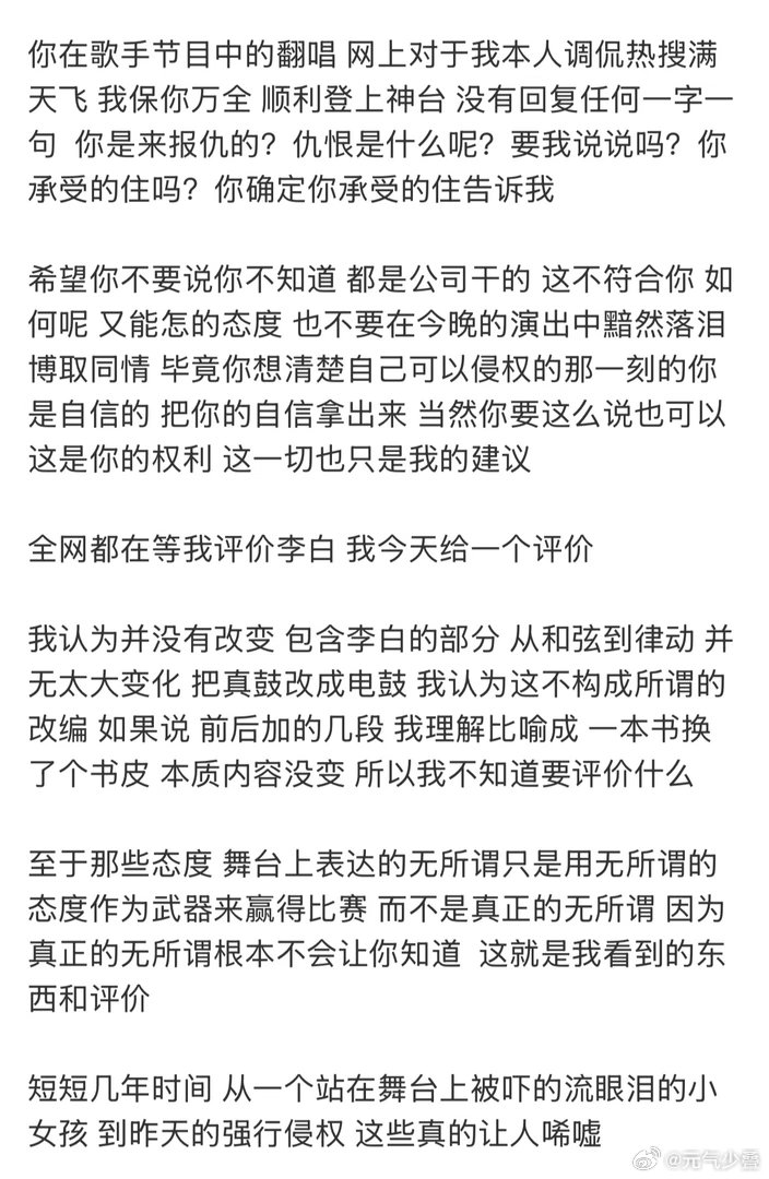 没想到李荣浩这种老实人也被逼急了,有个性是好事,但是不尊重版权原作者就很没品,单以前在好声音的时候,真的是很单纯的小女孩,现在是飘了好多。