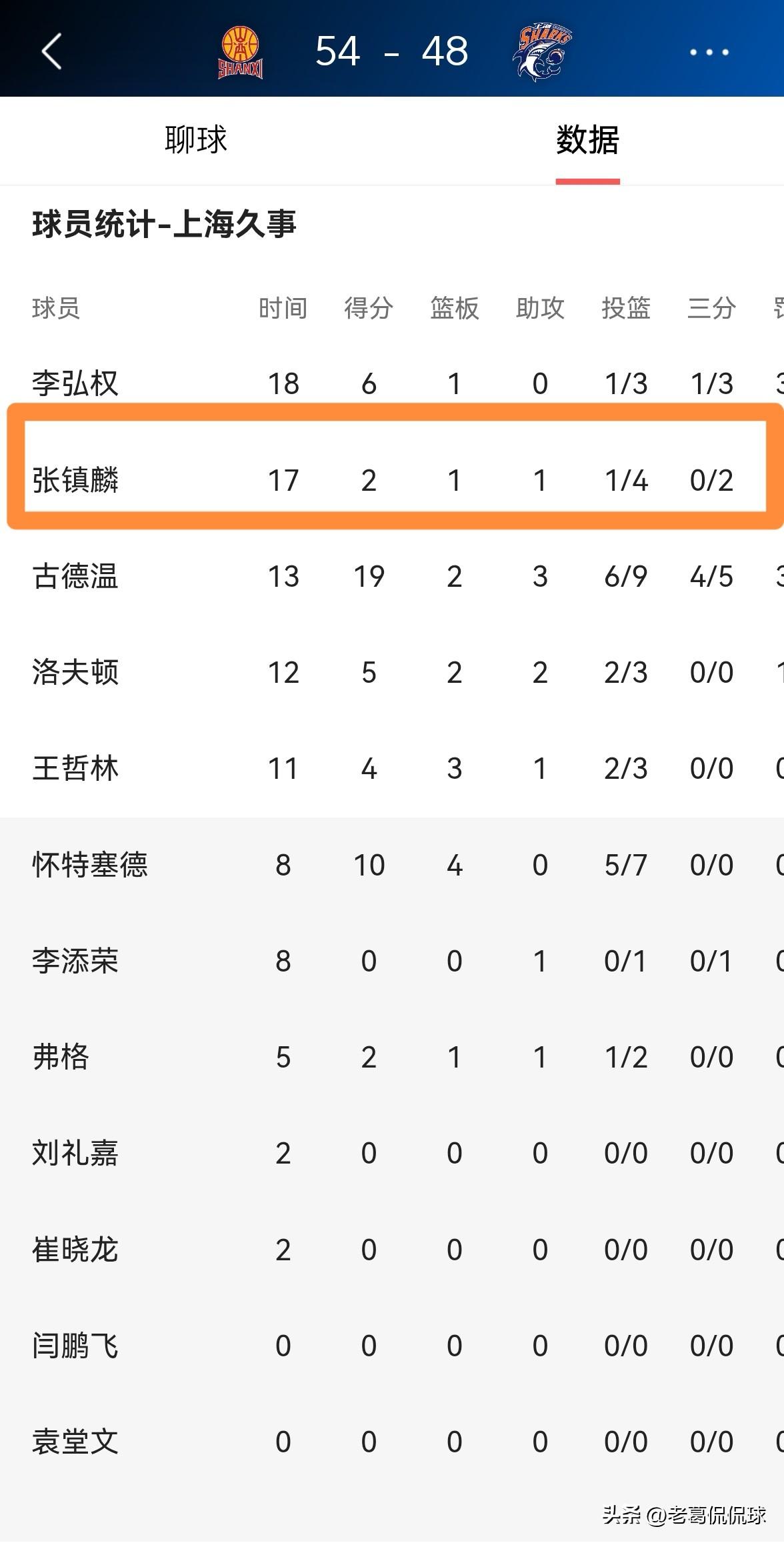 上海久事巨星张镇麟真是手感冰凉!在今天上海久事客场挑战山西汾酒的焦点战中,目前双方半场战罢,上海久事以48:54处于落后。在前两节比赛中,张镇麟的投篮手感非常冰凉,他在首发出战的17分钟里,投篮4中1,其中三分球2中0非常低效的得到2分。