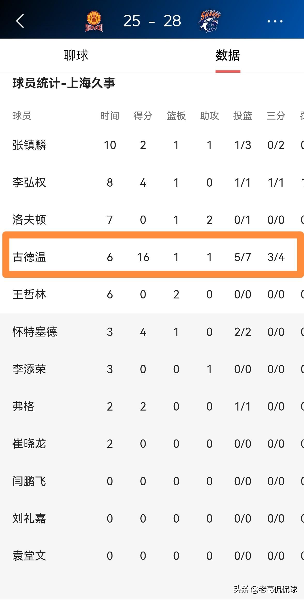 在第一节比赛中,古德温首发出战6分钟,投篮7中5,其中三分球4中3、罚球5中3狂砍16分,他的场上正负值为+8。