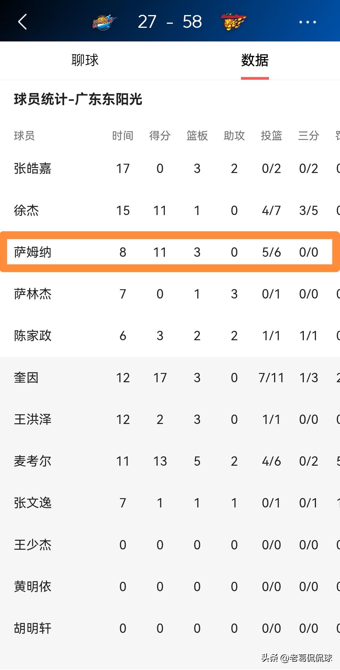 广东东阳光大外援萨姆纳真是毫不留情!在今天广东东阳光客场挑战四川丰谷酒业的比赛中,目前两队的上半场比赛已经结束,广东东阳光以58:27处于领先,形势看起来一片大好。值得一提的是,在前两节比赛中,萨姆纳面对旧主毫不留情,他在首发出战的8分钟里,投篮6中5,其中罚球1中1极其高效的砍下11分,还有3篮板,他的场上正负值为+13。