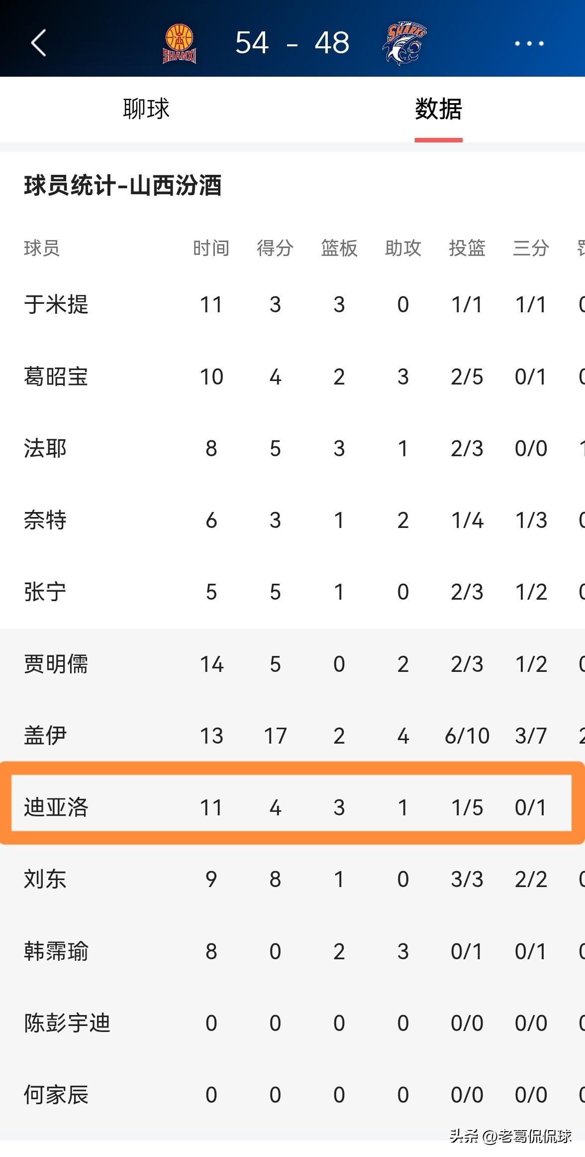 山西汾酒超级外援迪亚洛真是太黯淡了!在今天山西汾酒主场迎战上海久事的焦点战中,目前两队的上半场比赛已经结束,虽然山西汾酒以54:48领先对手6分,但是迪亚洛的表现非常的糟糕。
