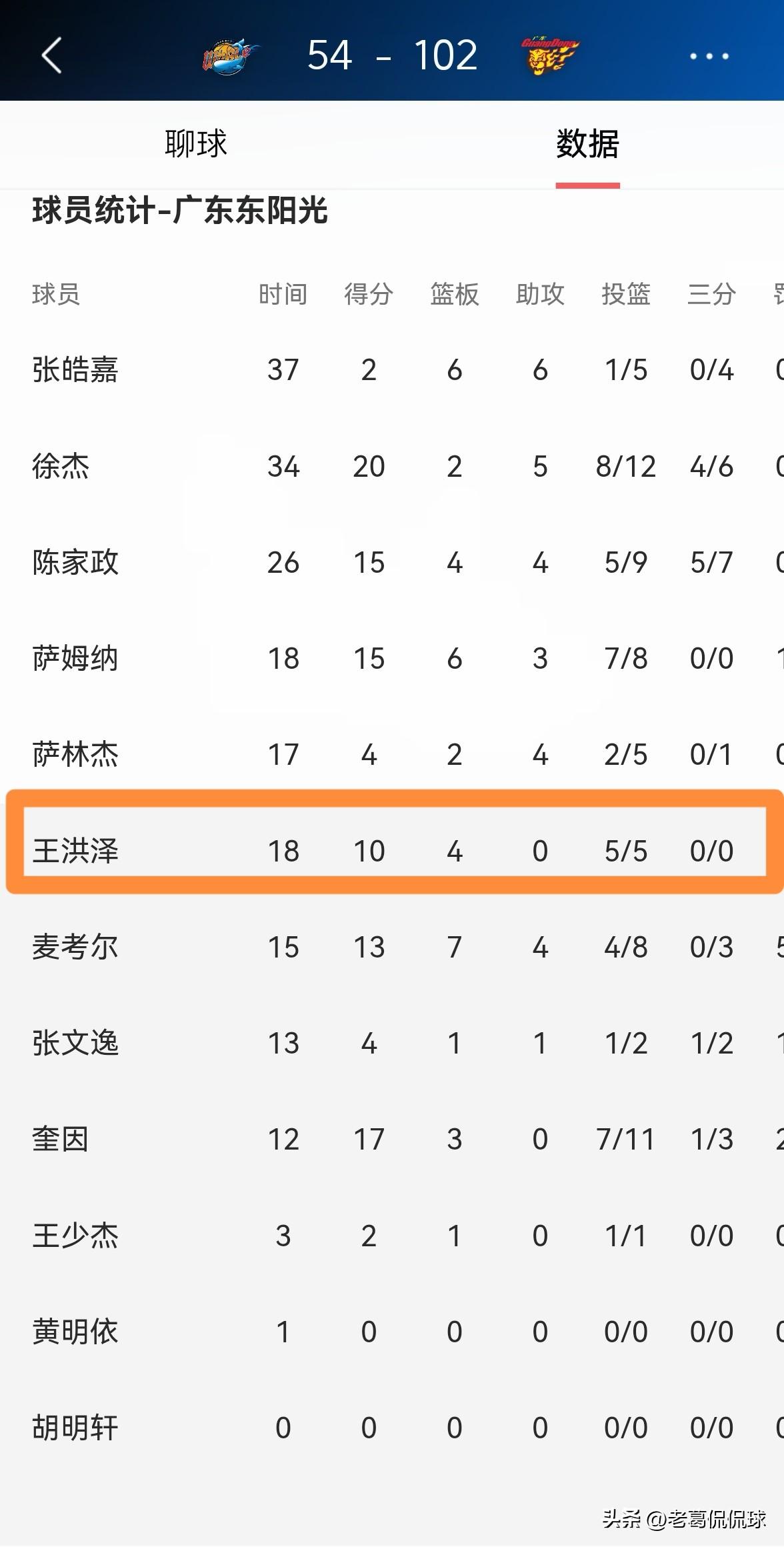 广东东阳光新星王洪泽真是太出彩了!在今天广东东阳光客场以102:54大胜四川丰谷酒业的比赛中,小将王洪泽的表现非常的出彩,他在替补出战的18分钟里,投篮5中5极其高效的砍下10分,还有4篮板,他的场上正负值为+25。