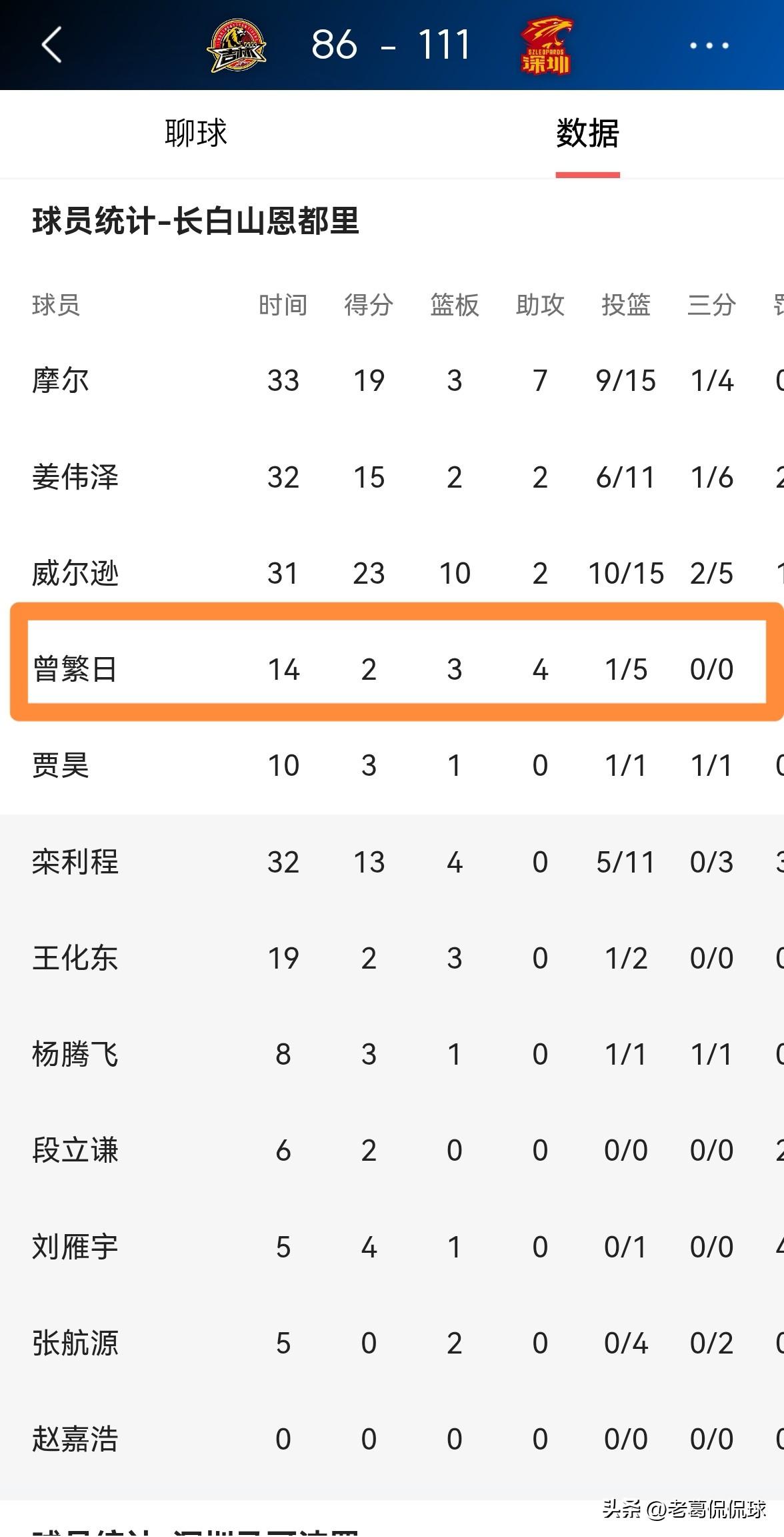 长白山恩都里中锋曾繁日的进攻效率真是太低了!在今天长白山恩都里主场以86:111惨败于深圳马可波罗的比赛中,曾繁日在进攻端的表现非常的低效。