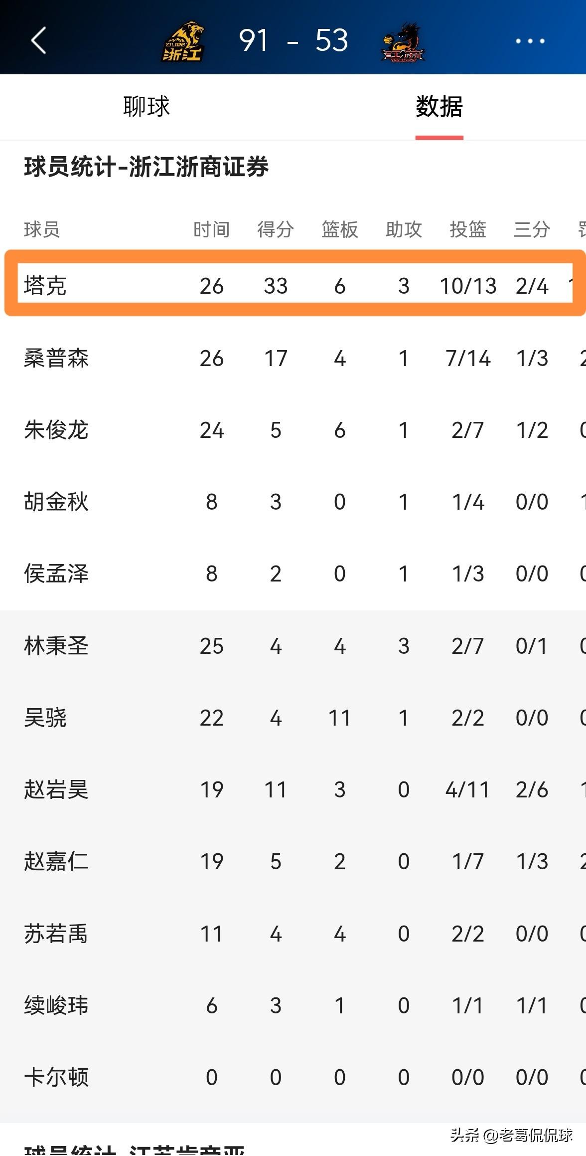 浙江浙商证券外援塔克真是太狠心了!在今天浙江浙商证券主场以91:53轻取江苏肯帝亚的比赛中,塔克对弱旅江苏肯帝亚毫不留情,全场比赛下来爆砍33分。