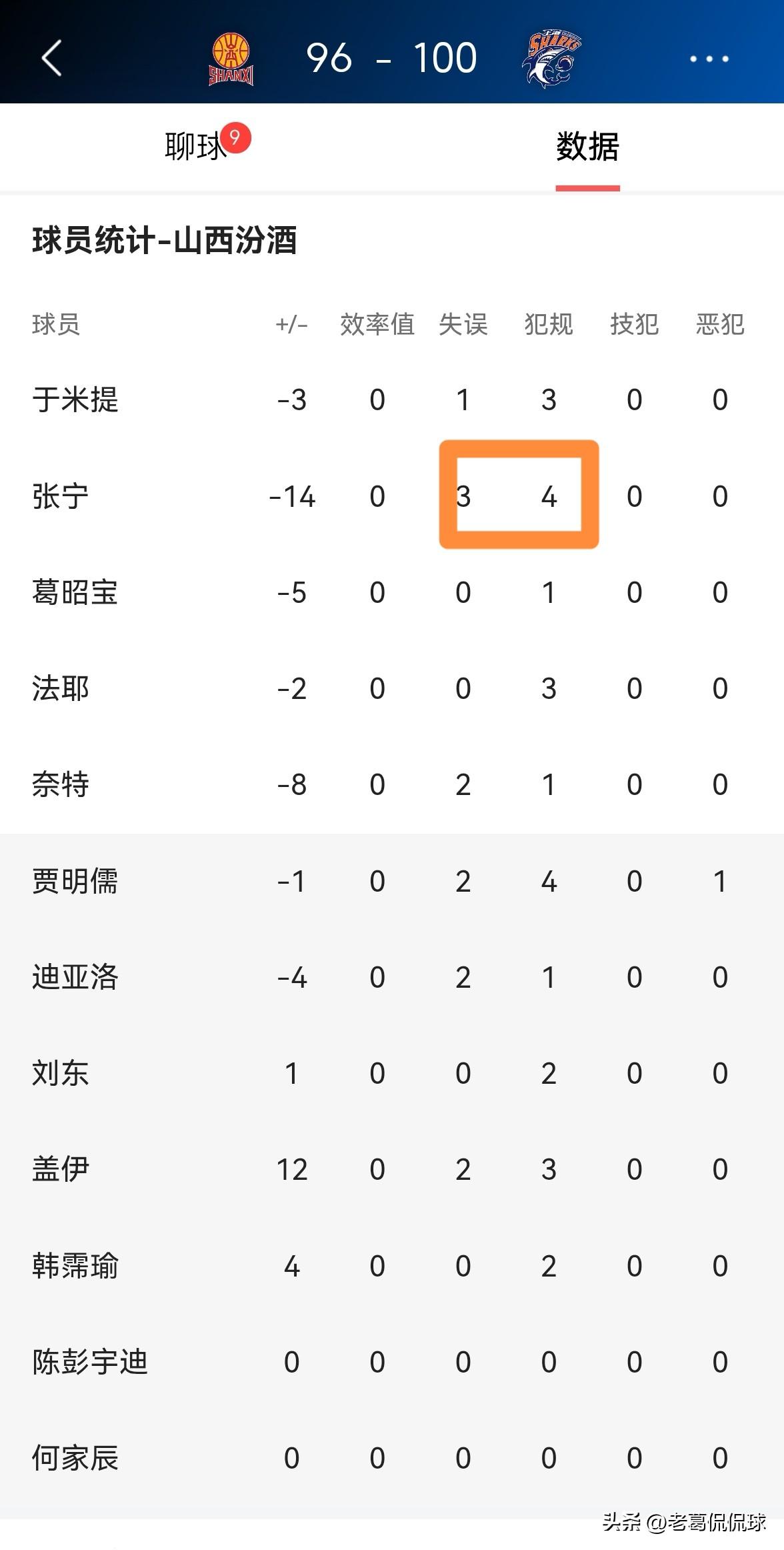 山西汾酒球星张宁的失误和犯规真是太多了!在今天山西汾酒主场以96:100惜败于上海久事的比赛中,张宁出现了3次失误和4次犯规,堪称球队失利的罪魁祸首。