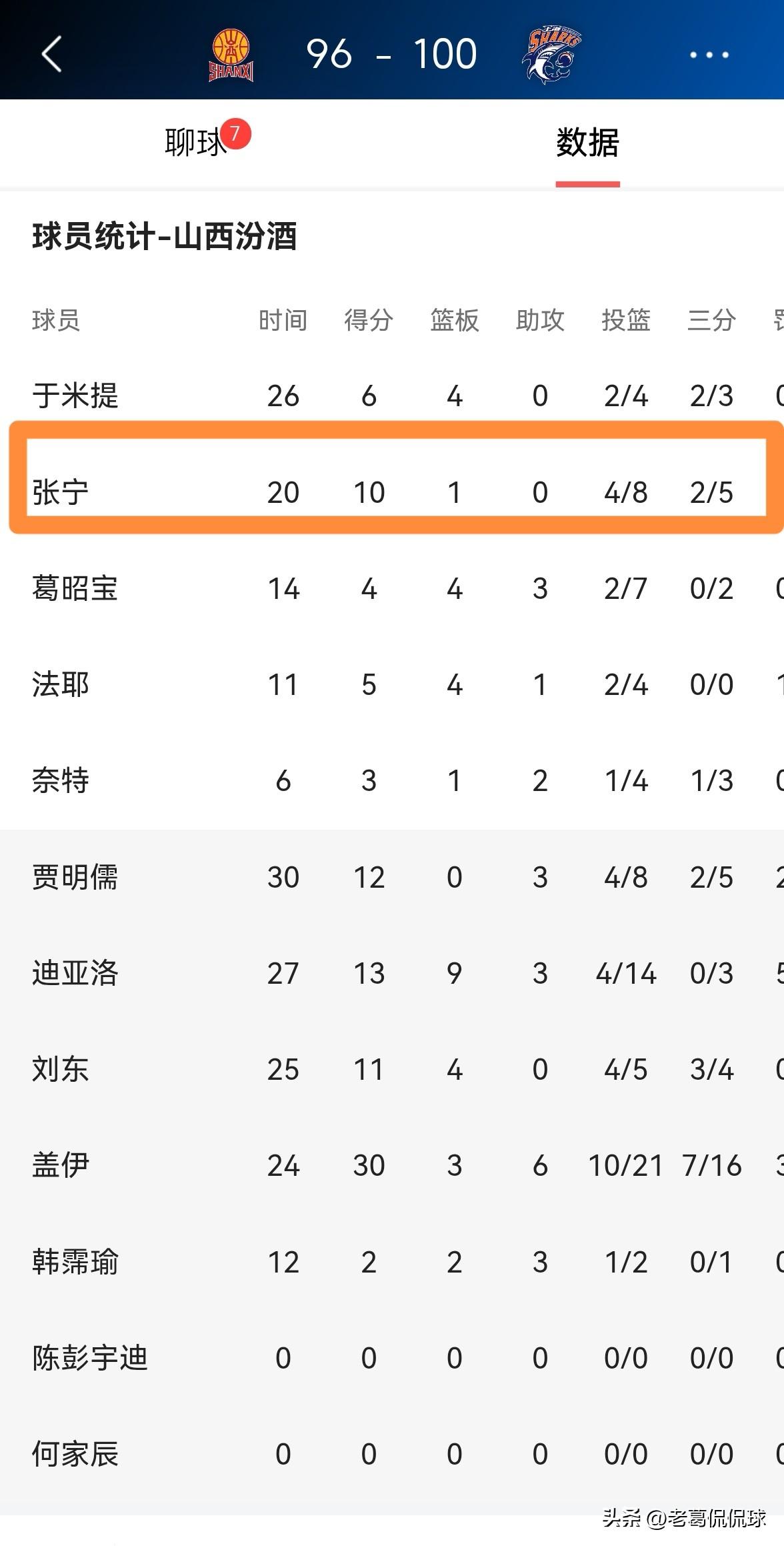 全场比赛下来,张宁首发出战20分钟,投篮8中4,其中三分球5中2得到8分,还有3次失误和4次犯规,他的场上正负值更是全队垫底的-14。