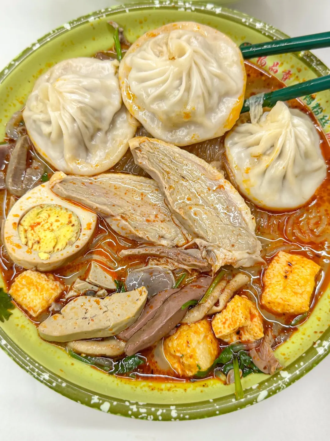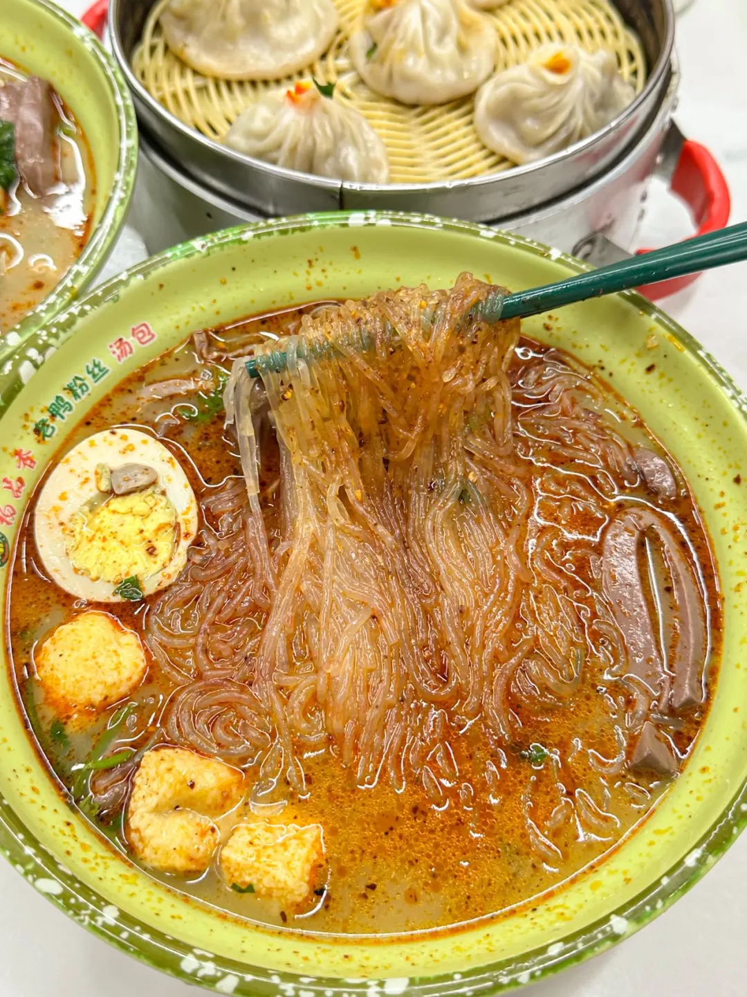 必点的肯定是招牌鸭血粉丝汤,这口汤真的太绝了!每天用老鸭慢火熬好几个小时,汤头清亮鲜香,一点不油腻,喝着全是食材本身的鲜味儿,不是调料包冲出来的敷衍口感。鸭血滑嫩无腥味,鸭肠鸭肝处理得干干净净,粉丝吸满了汤汁,再浇上一勺秘制辣油,谁吃谁知道