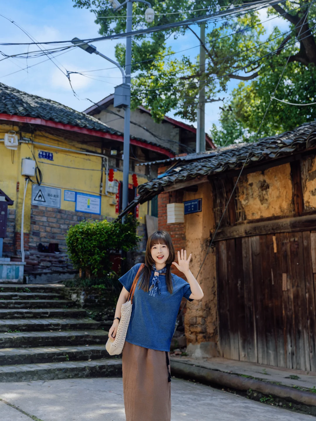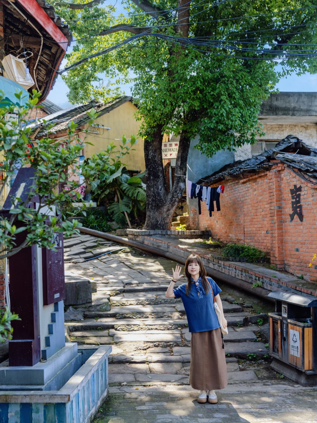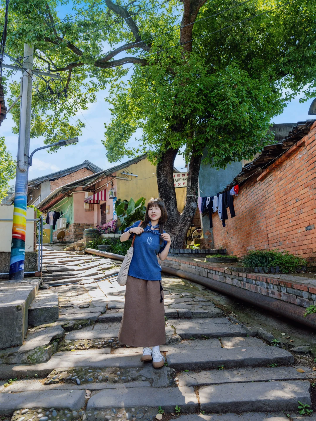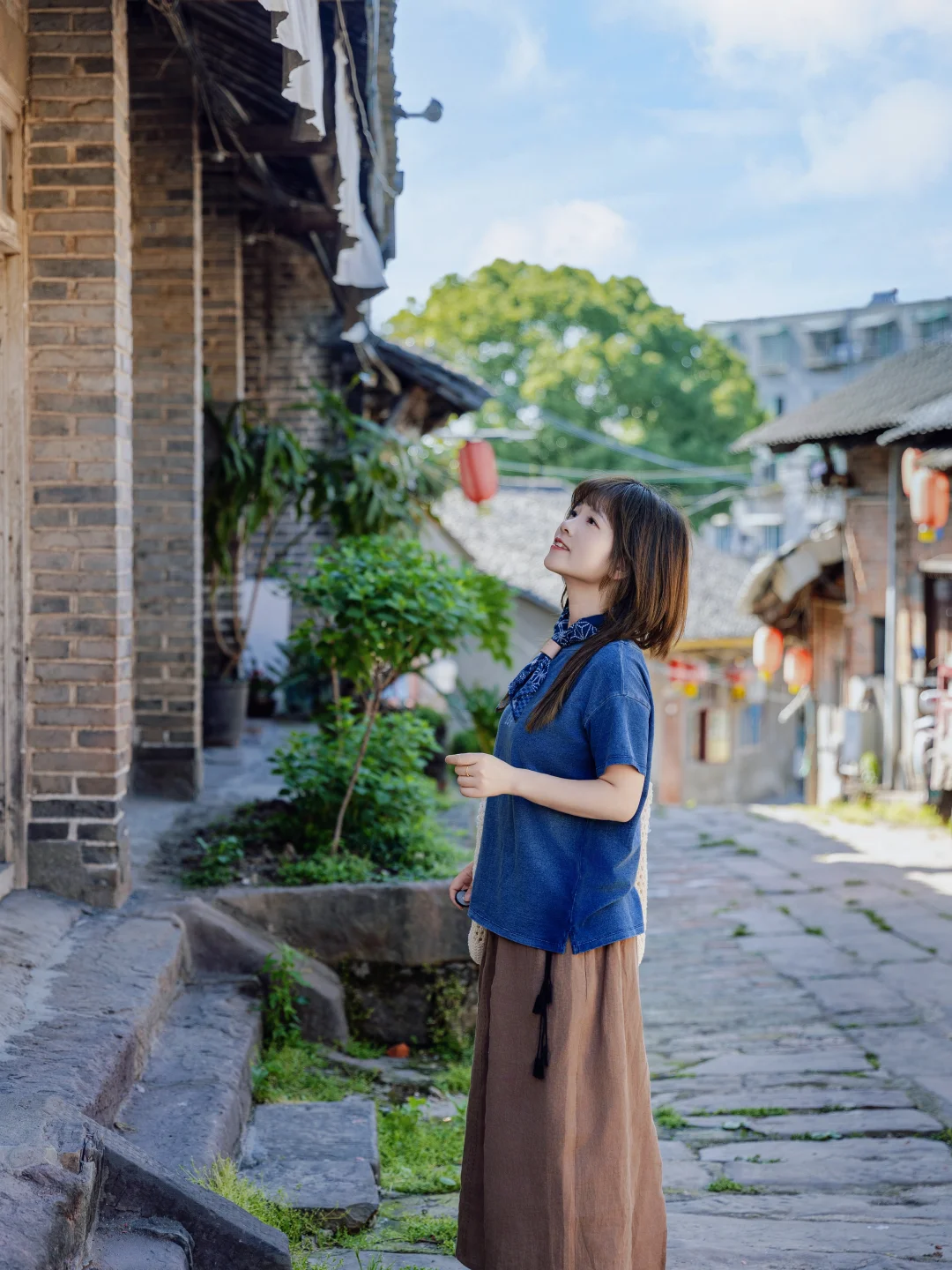 复古的蓝色短袖,搭配全亚麻的A字长裙,一整套都有做旧的感觉,像是被时光温柔的抚摸过,慵懒又随性