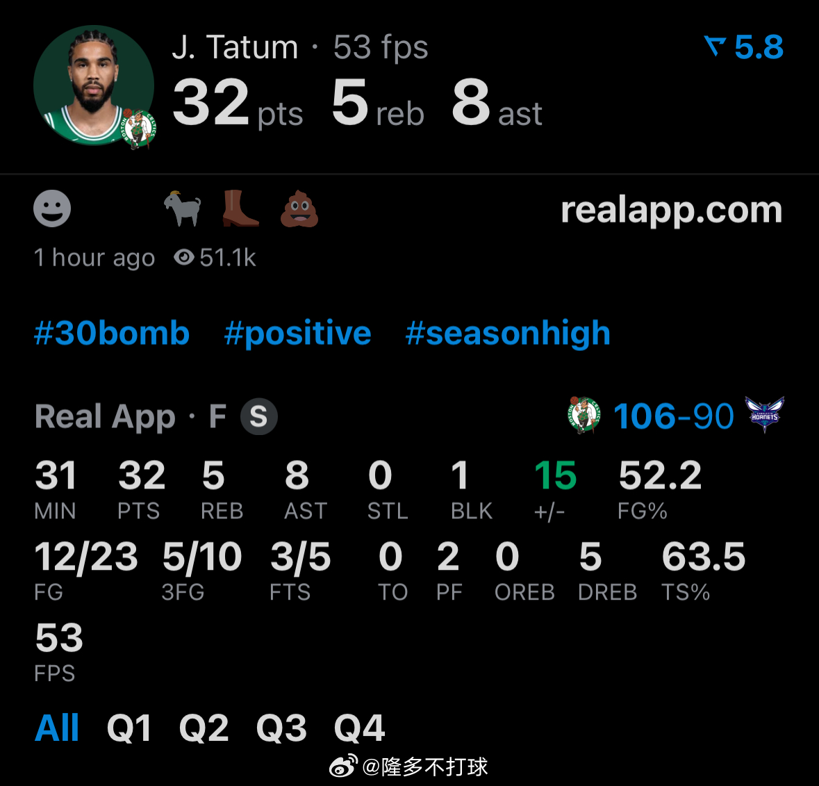 复出之后的首场30+,等待的时间不算久凯尔特人vs黄蜂