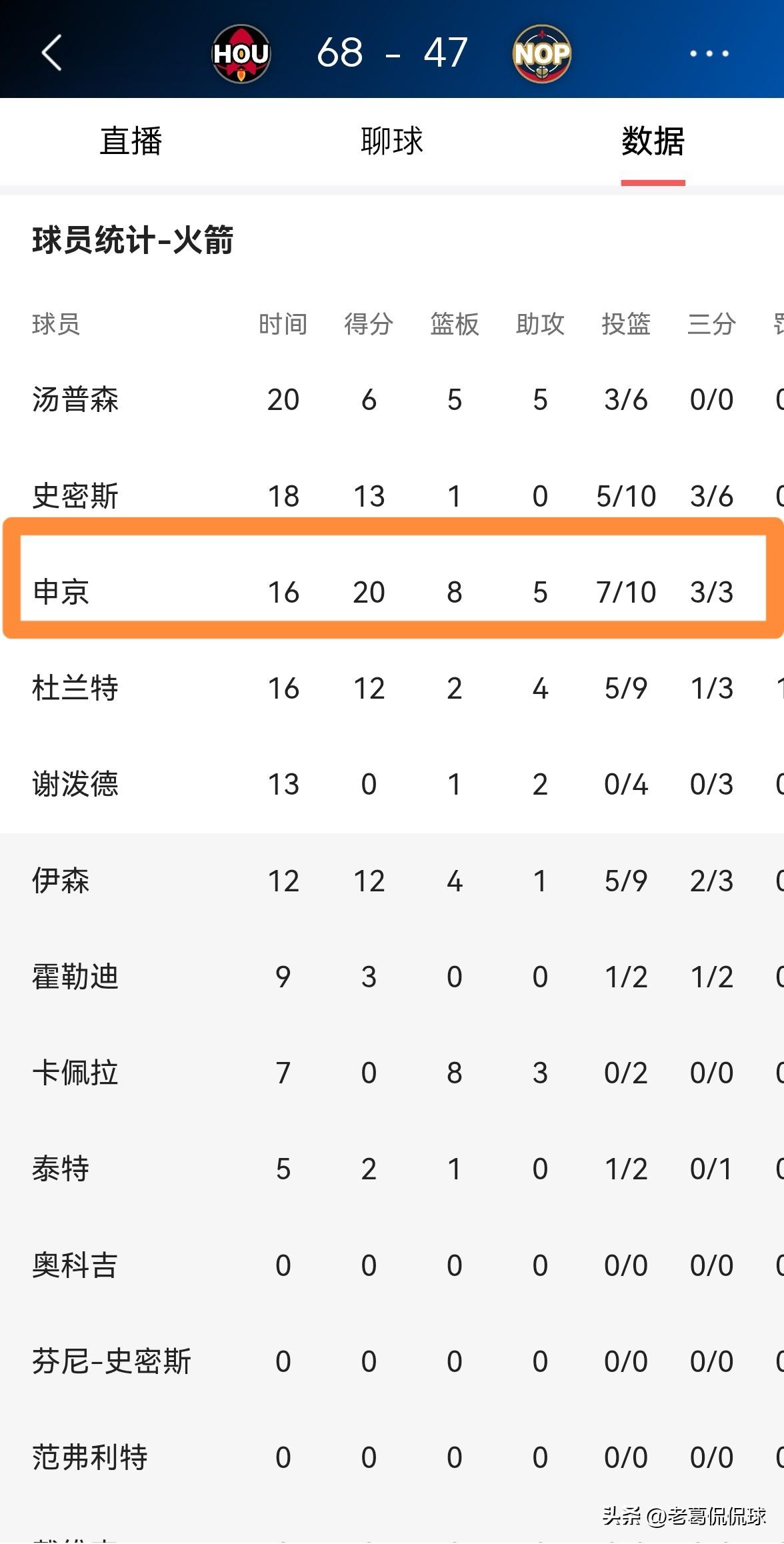 火箭超级中锋申京真是大放异彩!在今天进行的火箭和鹈鹕的比赛中,目前两队的上半场比赛已经结束,火箭凭借着申京的精彩表现以68:47领先对手多达21分,形势看起来一片大好。