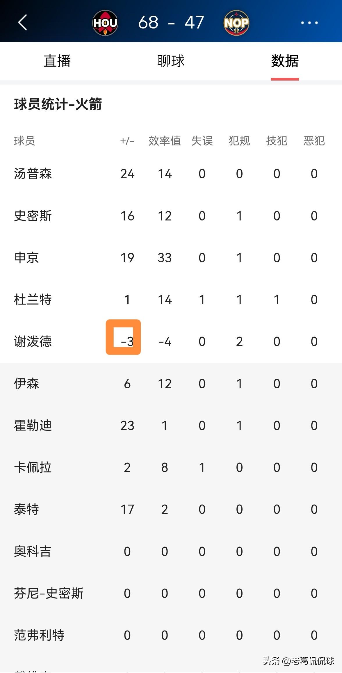 火箭超级新星谢波德的犯规数竟然高于得分!在今天火箭客场挑战鹈鹕的比赛中,目前双方半场战罢,虽然火箭以68:47领先对手21分,但是谢波德实在是不争气了,不仅一分未得,而且还有2次犯规。