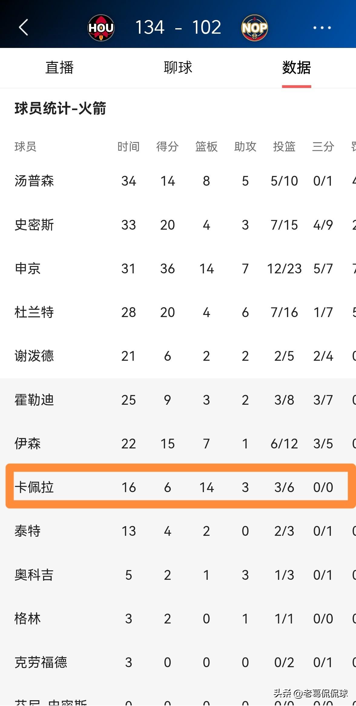 火箭老将卡佩拉在短短的16分钟里怒抢14篮板!在今天火箭客场以134:102轻取鹈鹕的比赛中,卡佩拉展现出了超强的篮板球保护能力,他在短短的16分钟里拼抢到了14个篮板,而首发中锋申京在31分钟的上场时间里抢到14个篮板。