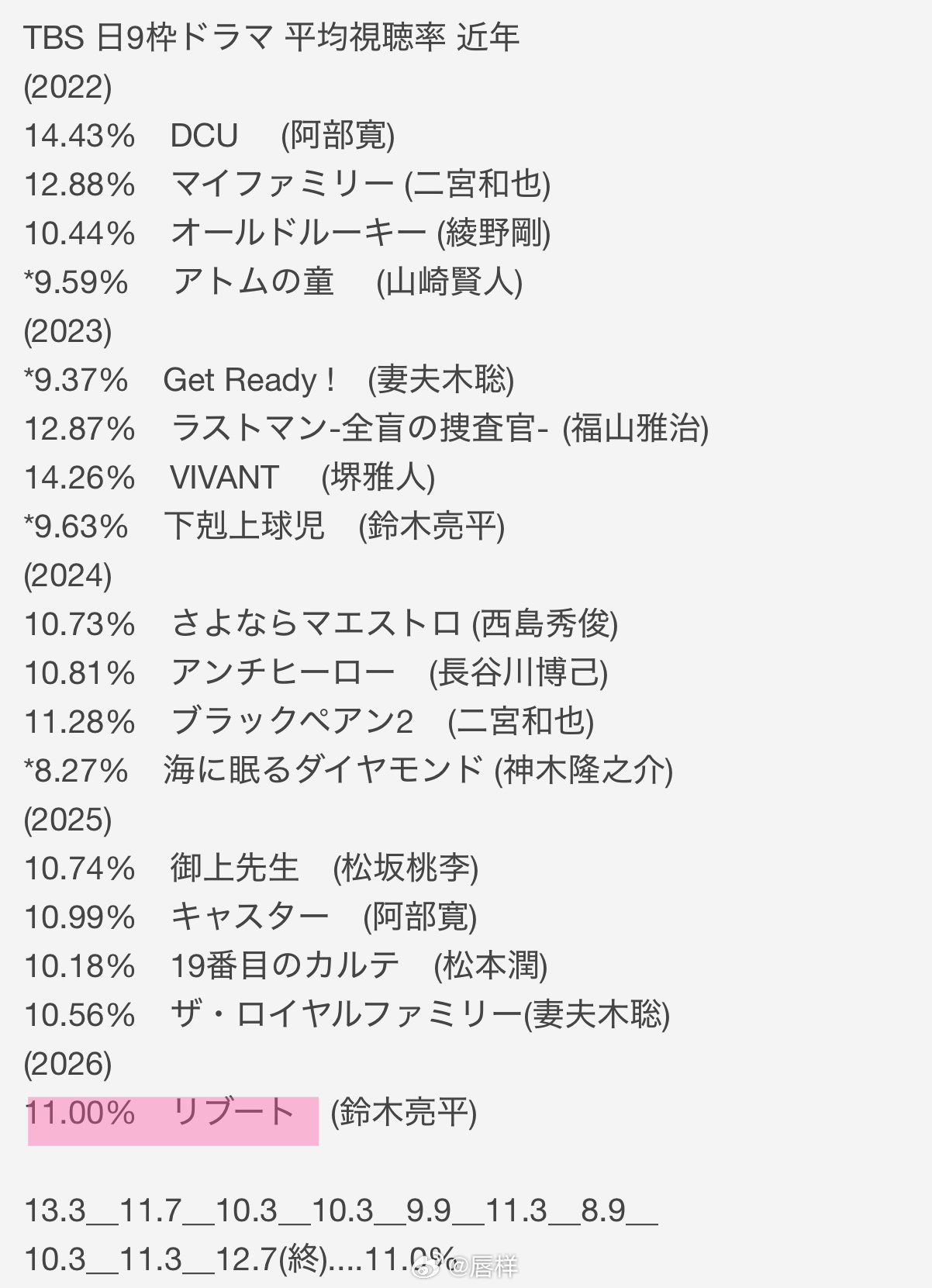 铃木亮平主演TBS日9连续剧『重启』大结局世代收视12.7%,个人收视8.0%正式完结!全10集!
