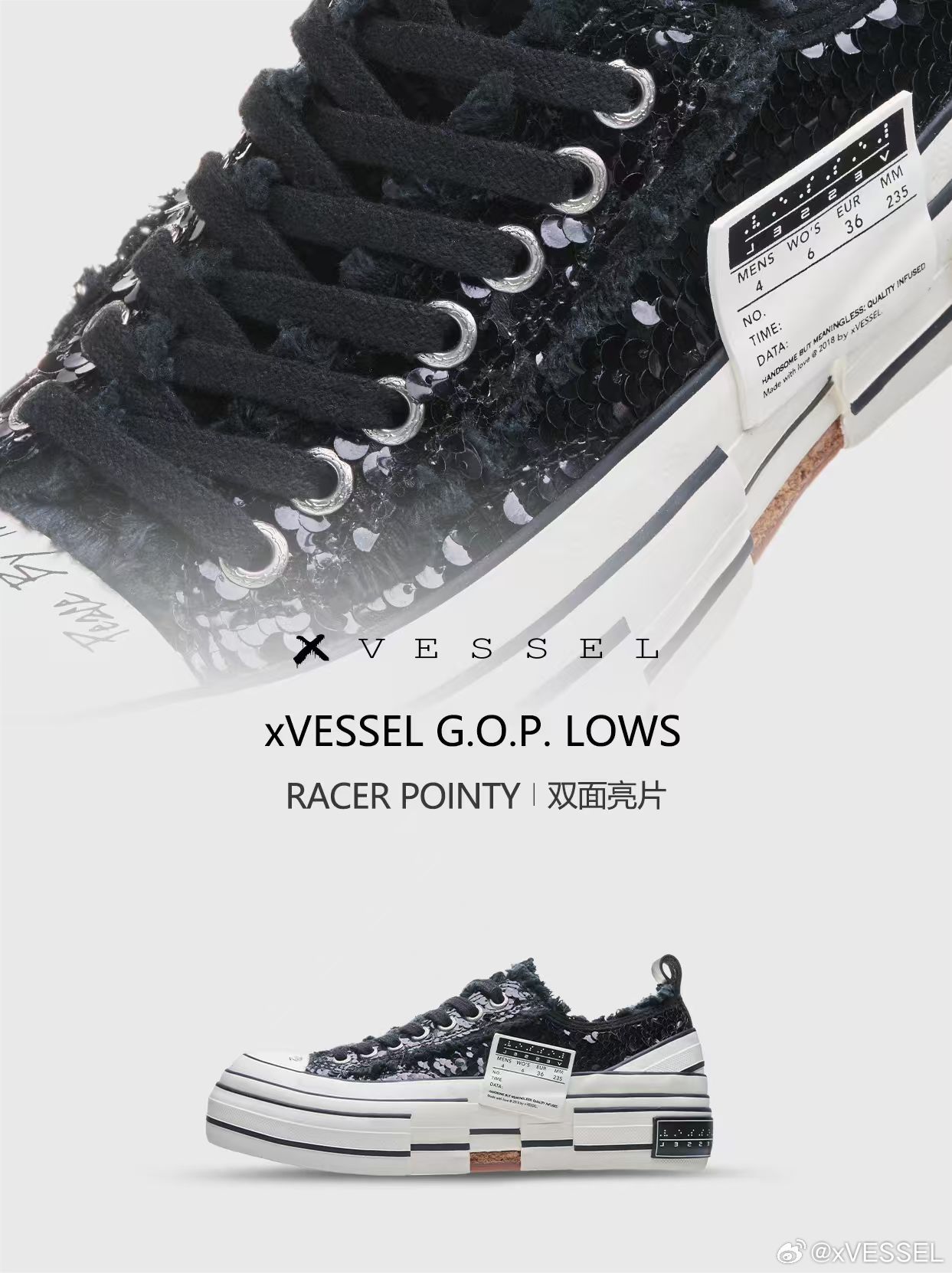 xVESSEL G.O.P LOWS RACER POINTY 「璀璨星河」即将迎来发售‼️当经典鞋型遇上双面亮片,每一步都在光影间制造视觉层次黑色与银色在步履间自然切换,交织出星群闪烁的瞩目焦点