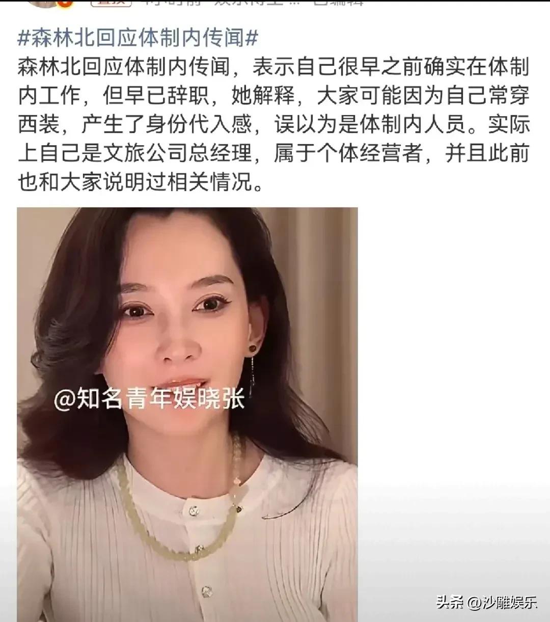 但这次,森林北不再选择沉默,也不再任由误解发酵。她直接来了个“身份大起底”,坦诚地回应了所有猜测:“我早年确实在体制内待过,但早就辞职了。现在我是文旅公司的总经理,是地地道道的个体经营者。”