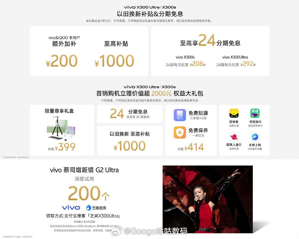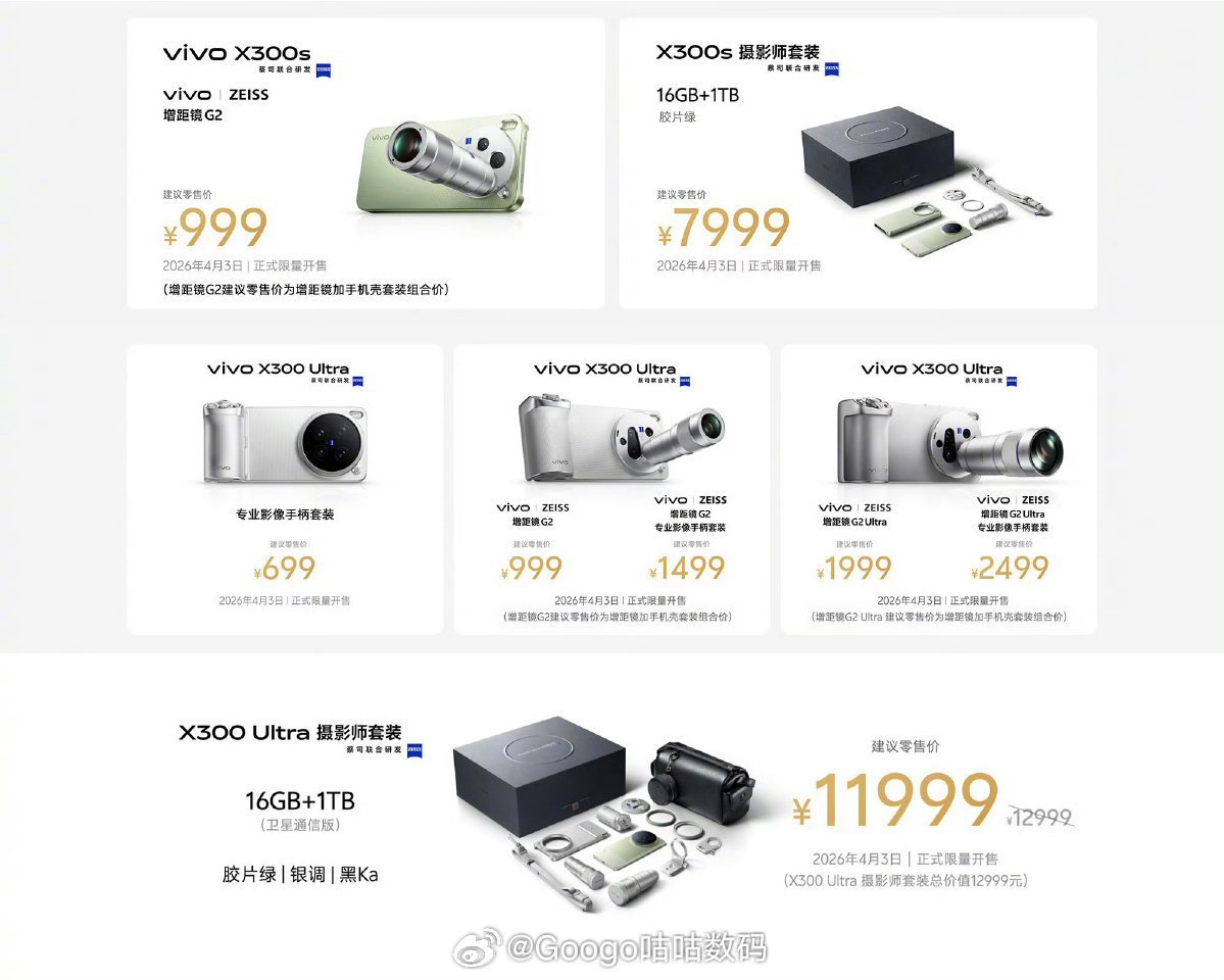 vivo蔡司增距镜 G2,售价999元,可适配X300 Ultra和 X300s。vivo蔡司增距镜 G2 Ultra,售价1999元,可适配X300 Ultra。vivo X300s摄影师套装同步推出,7999元。全家福X300 Ultra 摄影师套装,11999元vivox300ultra专业v单vivo