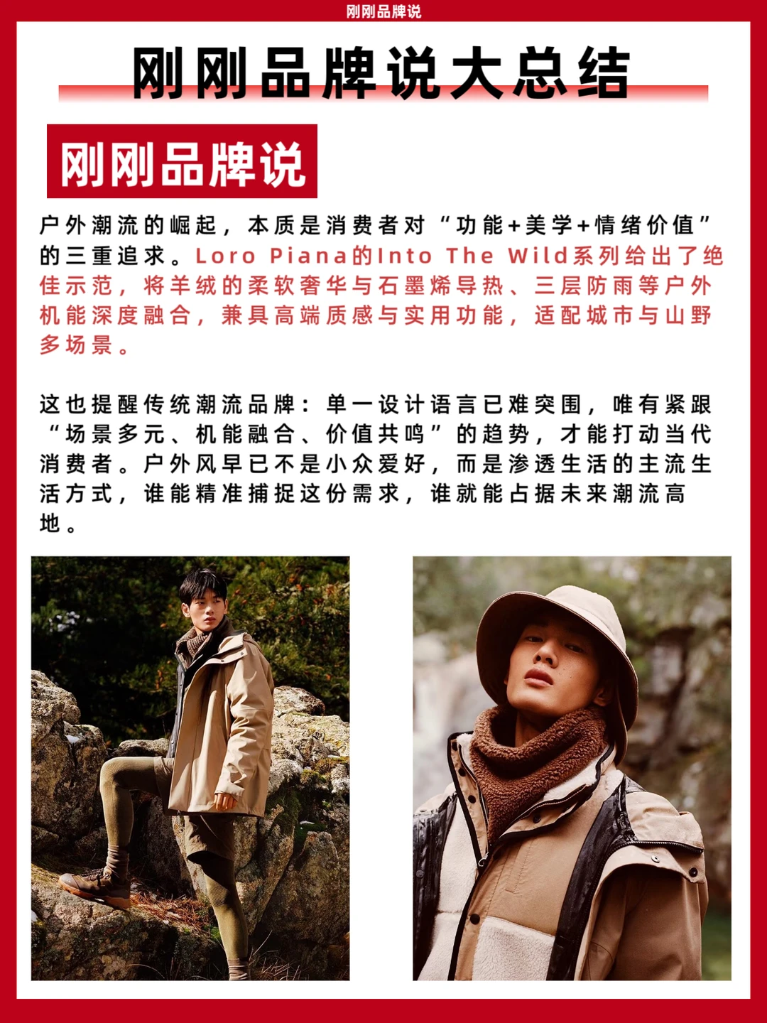 户外潮流的崛起,本质是消费者对“功能+美学+情绪价值”的三重追求。Loro Piana的Into The Wild系列给出了绝佳示范,将羊绒的柔软奢华与石墨烯导热、三层防雨等户外机能深度融合,兼具高端质感与实用功能,适配城市与山野多场景。