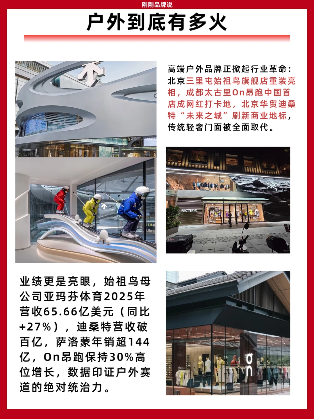 高端户外品牌正掀起行业革命:北京三里屯始祖鸟旗舰店重装亮相,成都太古里On昂跑中国首店成网红打卡地,北京华贸迪桑特“未来之城”刷新商业地标,传统轻奢门面被全面取代。业绩更是亮眼,始祖鸟母公司亚玛芬体育2025年营收65.66亿美元(同比+27%),迪桑特营收破百亿,萨洛蒙年销超144亿,On昂跑保持30%高位增长,数据印证户外赛道的绝对统治力。