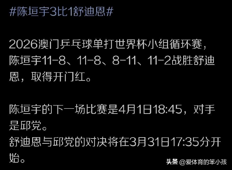 无独有偶,原本没拿到世界杯参赛机会的国乒小将陈垣宇,和林兆恒一样,因为有球员退赛,更确切的说是丹麦选手格罗特的退赛,很幸运的拿到了一个世界杯单打的参赛名额——他也和林兆恒一样,没让机会溜走,小组赛首轮面对新西兰球员舒迪恩这位并不熟悉的对手,实现了3:1的胜出,也就此拼下自己的世界杯小组赛首胜。此役双方四局的具体比分是11:8,11:8,8:11和11:2。