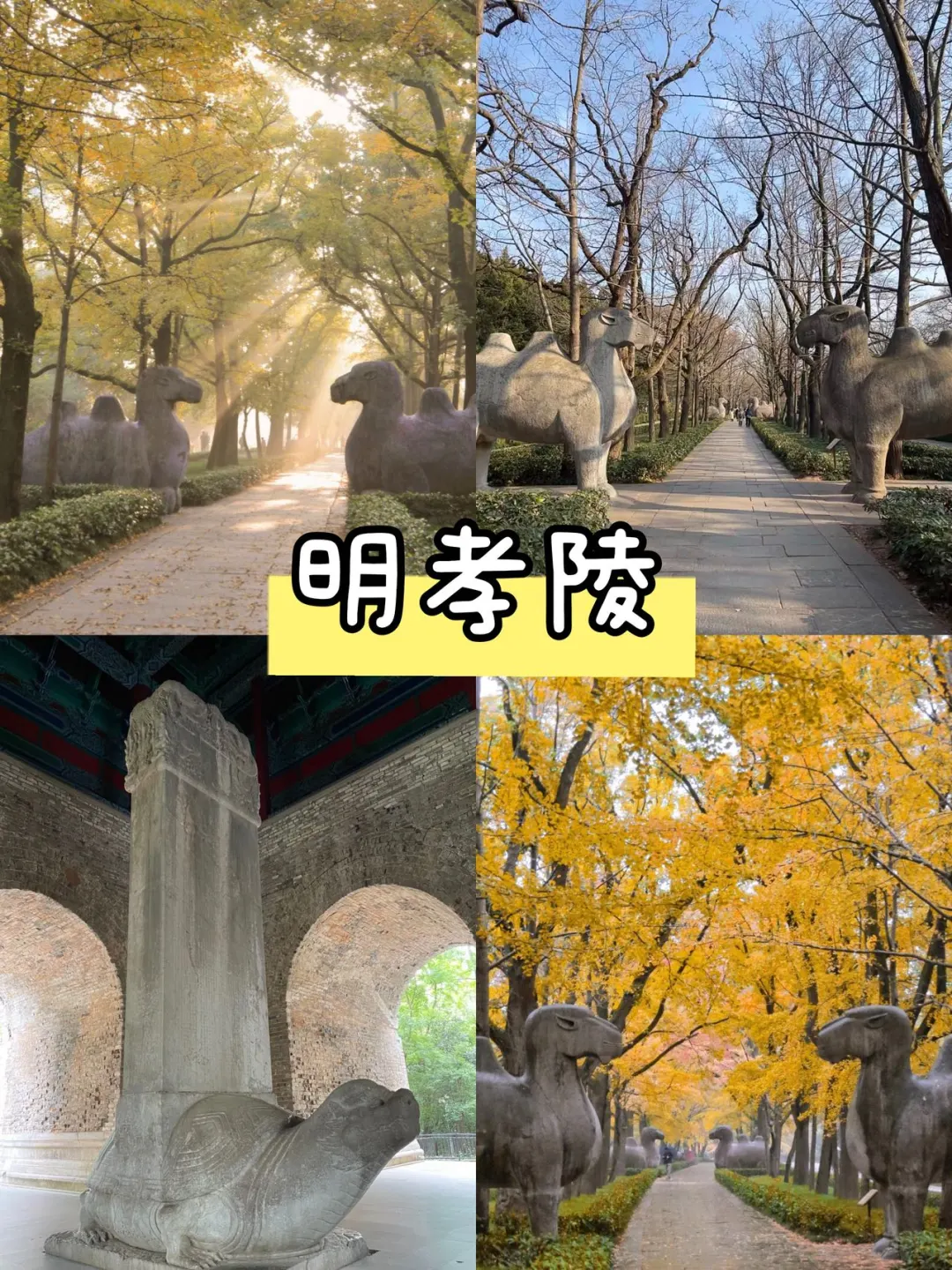 从南博出来,打车或乘公交直达明孝陵。石象路是必走的“南京最美600米”,600年的神兽石刻古朴庄重,红墙与绿植相映,随便拍都是古风大片。接着去四方城,看“大明孝陵神功圣德碑”,感受皇家陵寝的历史厚重感。