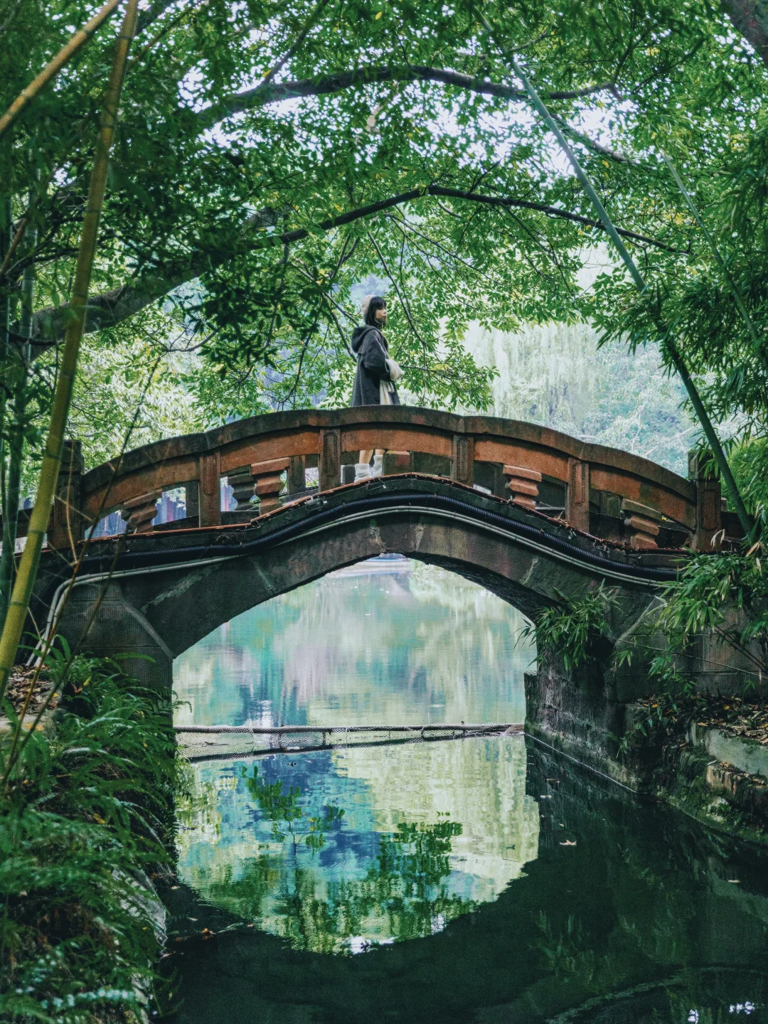 整个公园里面翠艳欲滴的,有小木屋🏕️,有超美的亭子,还有红墙,小桥流水人家