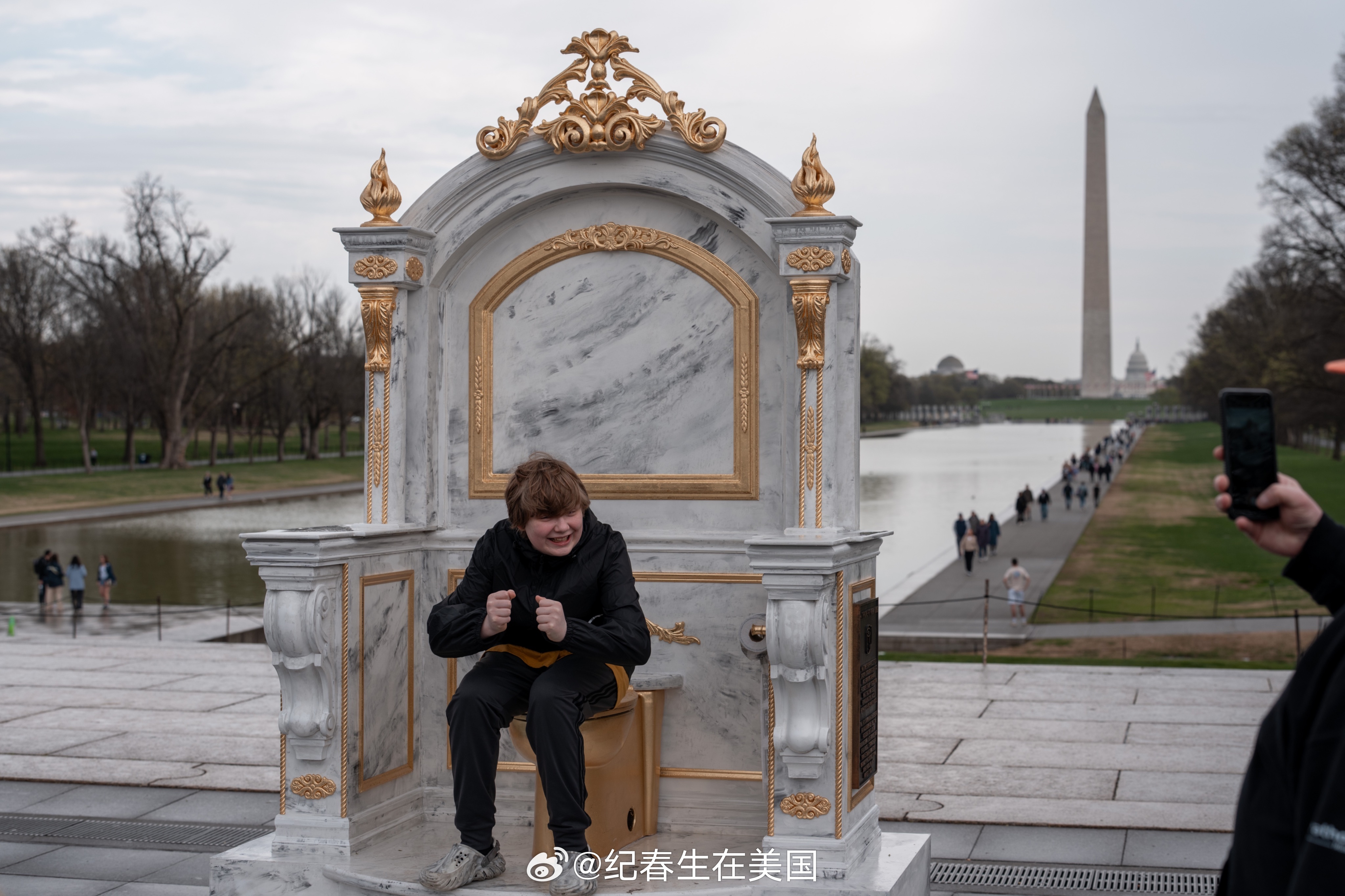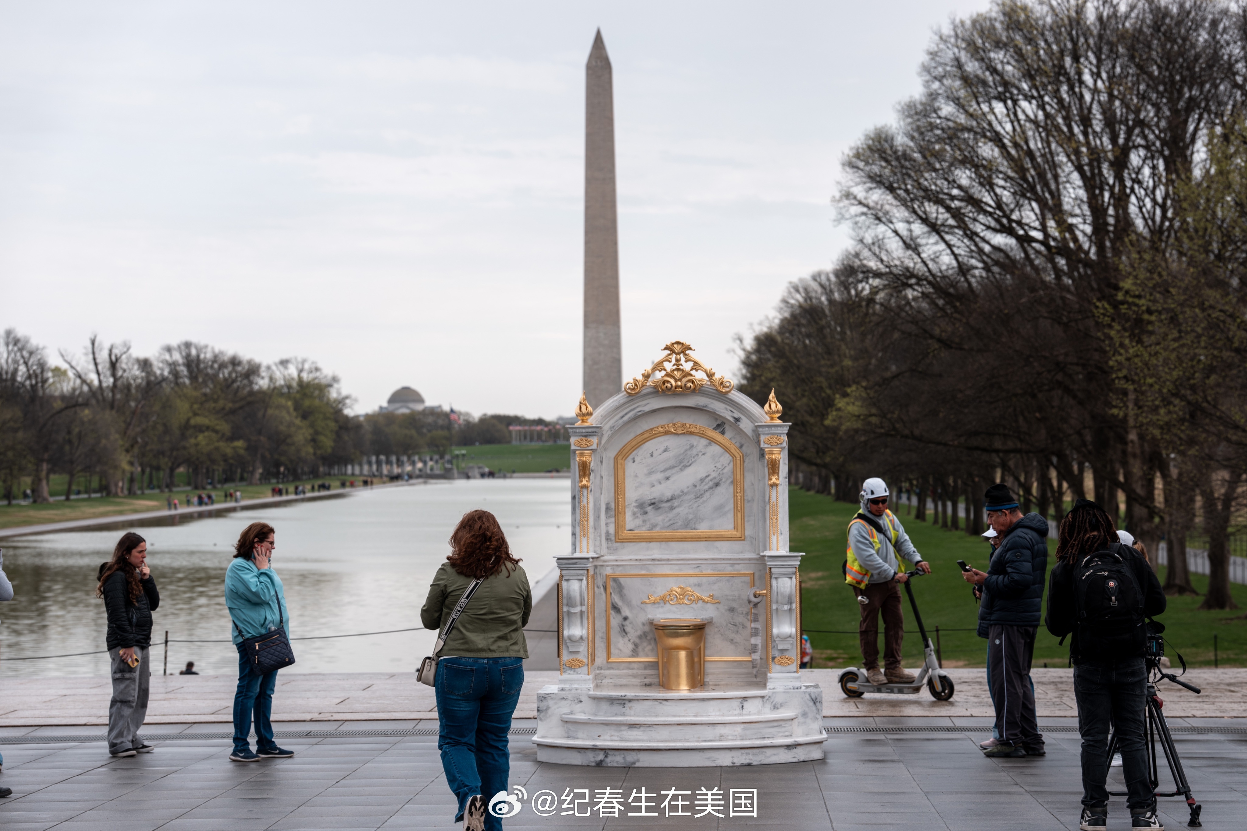 今天在华盛顿林肯纪念堂对面出现了一个巨大的大理石底座金色马桶雕塑,名为“适合国王的宝座”(A THRONE FIT FOR A KING)。