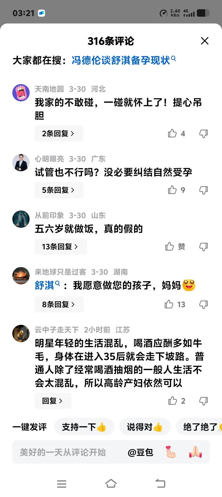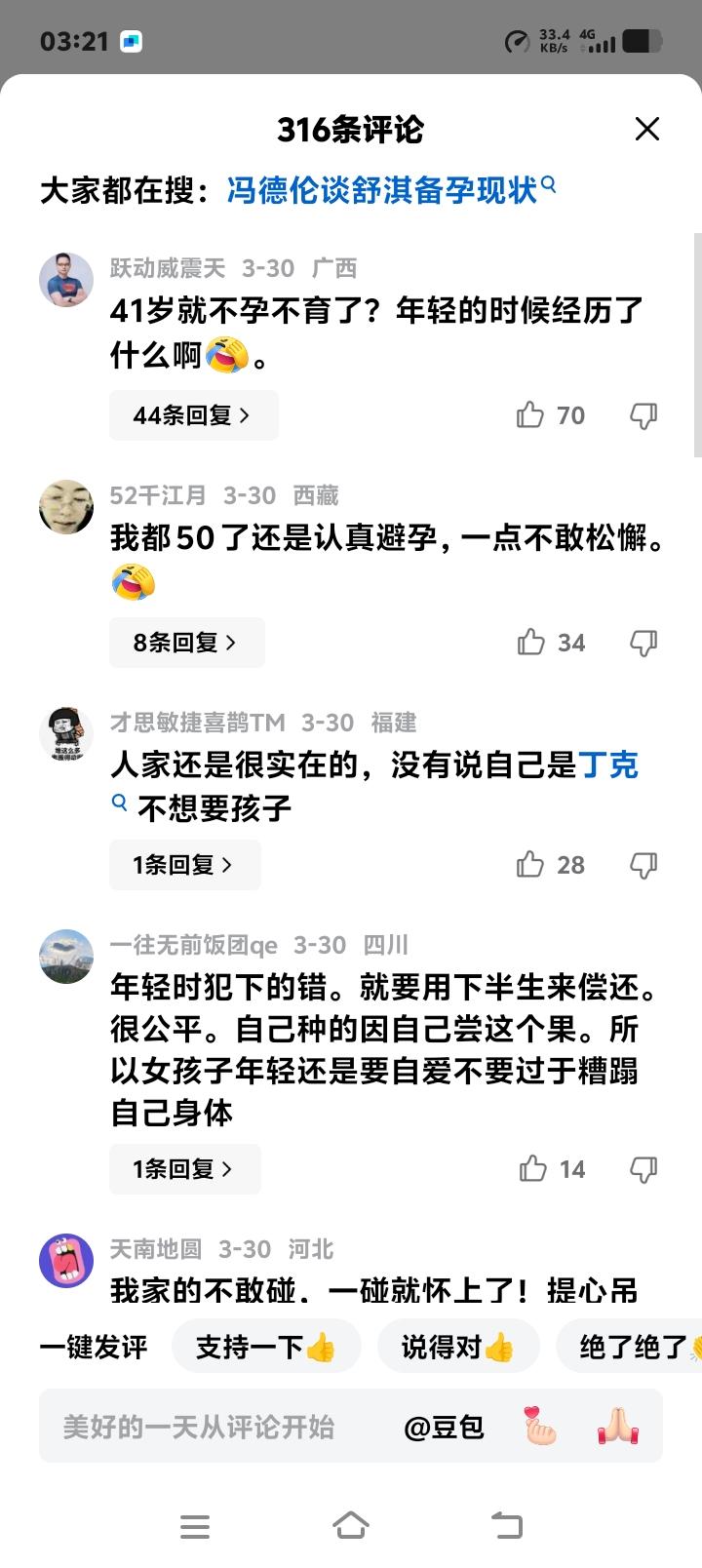 无数女性在舒淇的故事里看见了自己。有人42岁意外怀上二胎,有人28岁就面临生育危机,有人在“最佳生育年龄”的焦虑中仓促选择。评论区成了众生相的展台:要不到的,不敢要的,随便怀的,拼命保的……每个故事背后,都是一个女性与生育时钟的博弈。