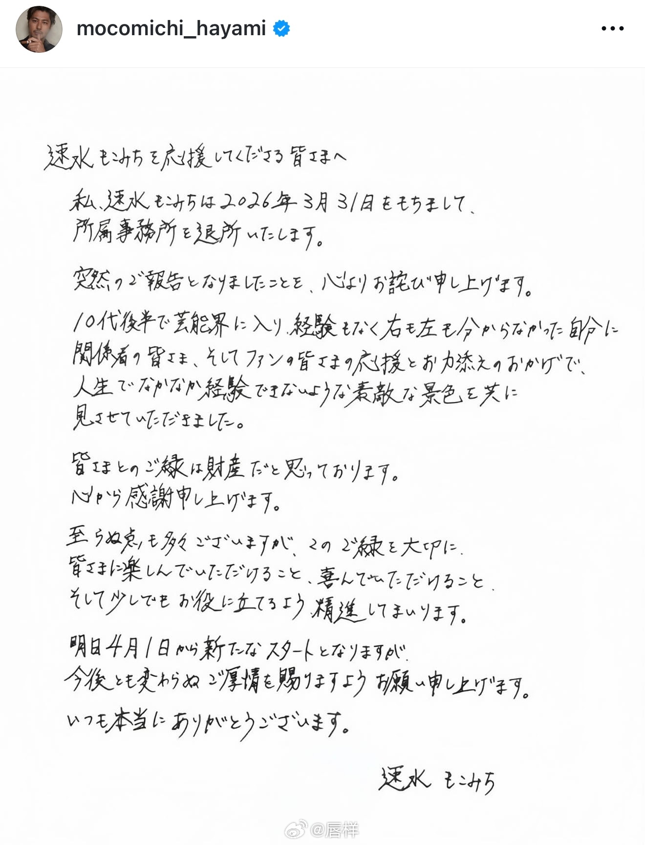 他公开了亲笔信,以“致所有支持速水重道的各位”开篇,文中写道:“我,速水重道,于2026年3月31日正式离开所属事务所。对于这一突然的通知,我在此致以由衷的歉意。”