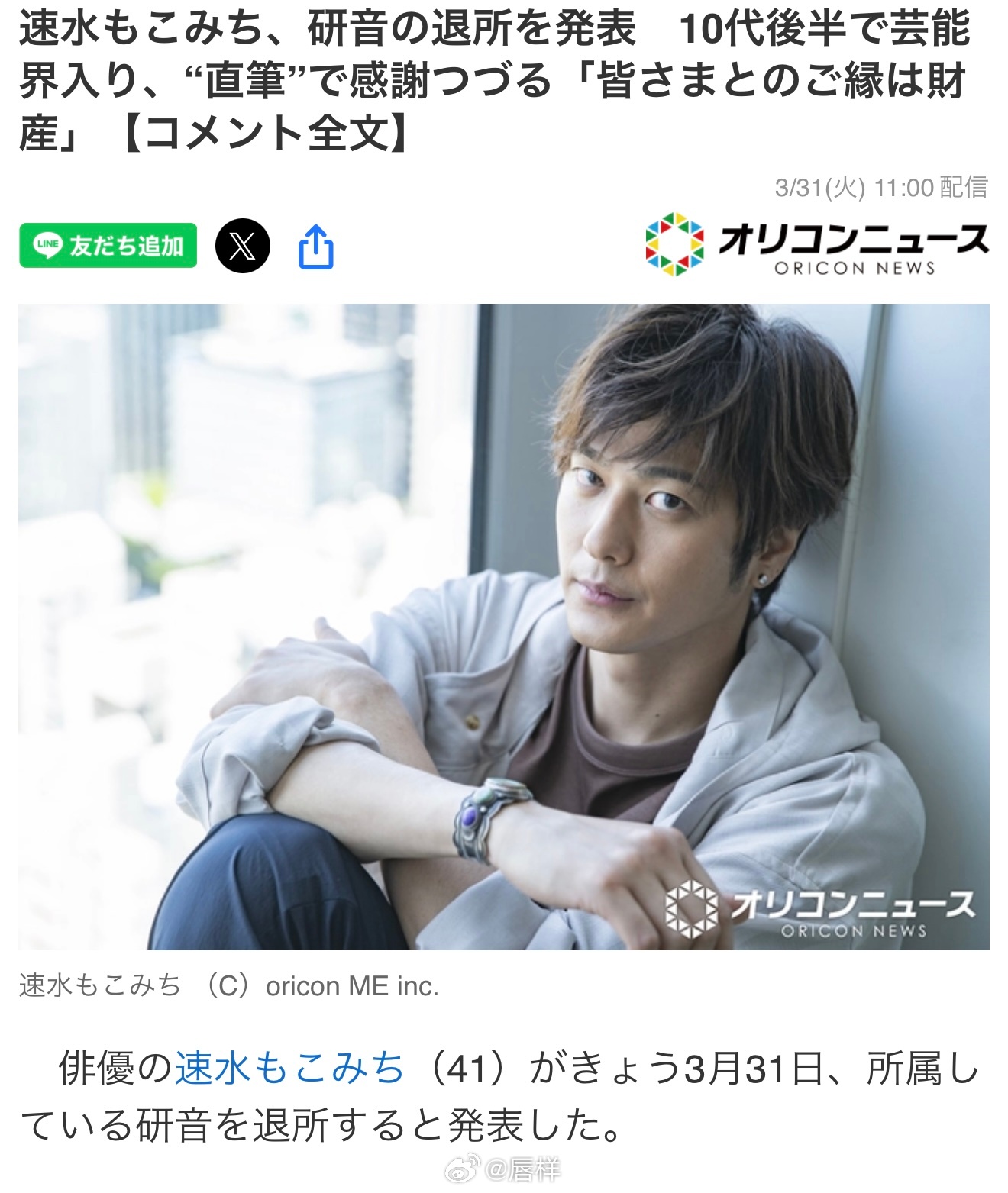 演员速水重道(41)于今日3月31日宣布,正式离开所属事务所研音。